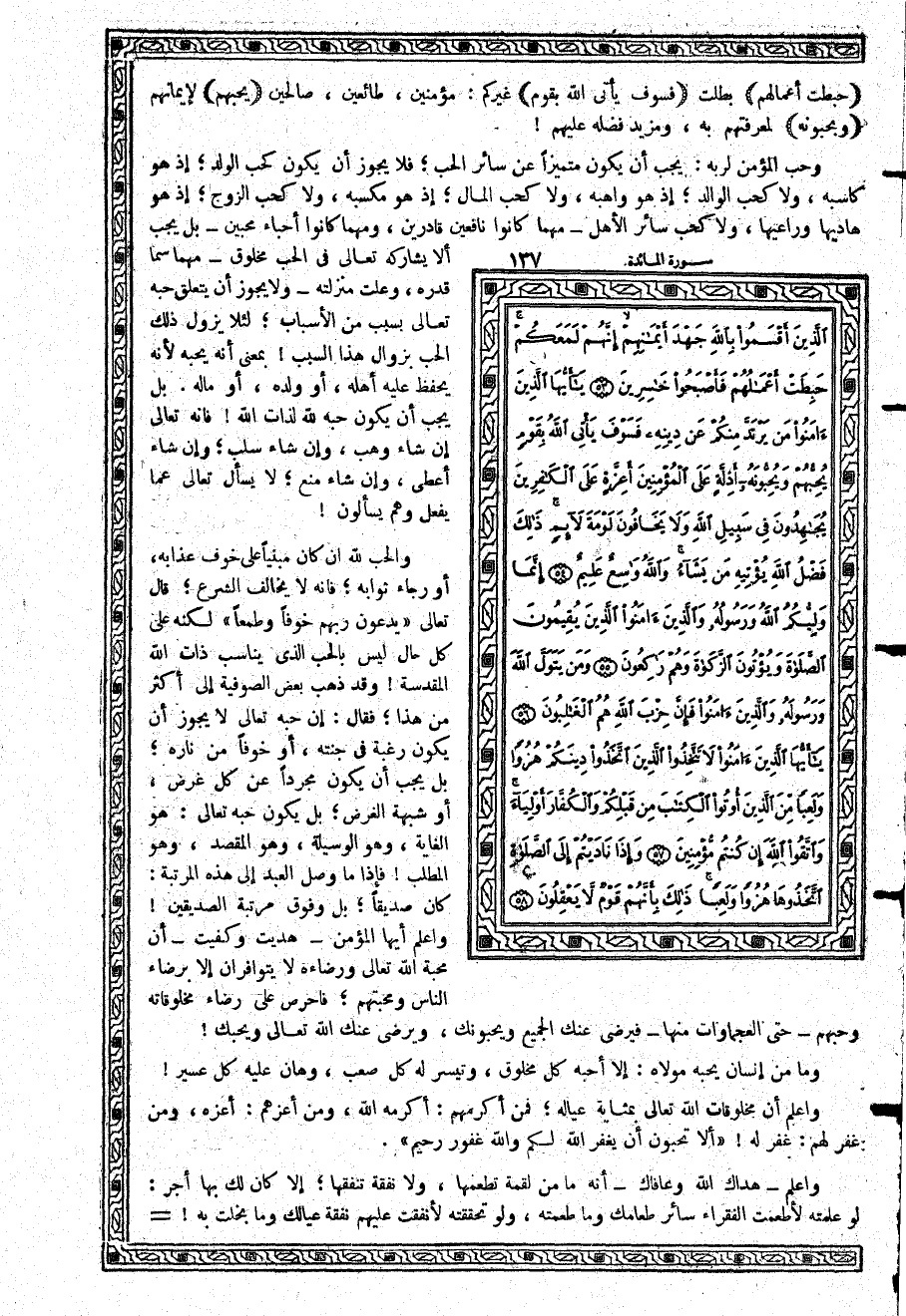 -[138]- واعلم - علم اليقين - أن الله تعالى معطيك بذلك ما تريد فوق ما تريد - في الحياة الدنيا - ومعطيك في الآخرة ما لم تتوهمه، وما لم يخطر ببالك وأن عطاءه تعالى ليس كعطائك - مهما بذلت - وأن مثوبته ليست كمثوبتك - مهما بالغت - فاعمل بذلك لدنياك وآخرتك؛ إني لك من الناصحين (انظر آية 22 من سورة المجادلة) {أَذِلَّةٍ عَلَى الْمُؤْمِنِينَ أَعِزَّةٍ} من علامة حب الله تعالى للمؤمن، وحب المؤمن لربه: أن يكون لين الجانب متواضعاً لإخوانه المؤمنين، قوي الشكيمة متسربلاً بالعزة والكبرياء حيال الكافرين والمنافقين؛ لا يراعى أحداً لسعته أو لبطشه. أقدار الناس عنده تتسامى بإيمانهم وتقواهم، لا بقوتهم وغناهم من خلصائه وأوليائه