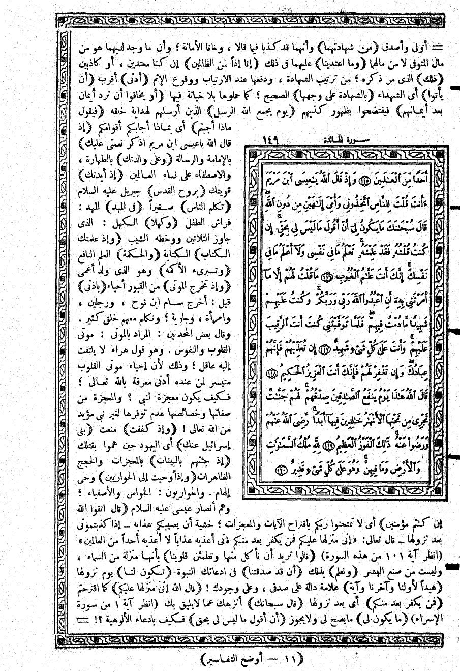 {إِذْ قَالَ اللَّهُ يعِيسَى ابْنَ مَرْيَمَ اذْكُرْ نِعْمَتِي عَلَيْكَ} بالإمامة والرسالة {وَعَلَى وَالِدَتِكَ} بالطهارة، والاصطفاء على نساء العالمين {إِذْ أَيَّدتُّكَ} قويتك {بِرُوحِ الْقُدُسِ} جبريل عليه السلام {تُكَلِّمُ النَّاسَ} صغيراً {فِي الْمَهْدِ} المهد: فراش الطفل {وَكَهْلاً} الكهل: الذي جاوز الثلاثين ووخطه الشيب {وَإِذْ عَلَّمْتُكَ الْكِتَابَ} الكتابة {وَالْحِكْمَةَ} العلم النافع {وَتُبْرِىءُ الأَكْمَهَ} وهو الذي ولد أعمى {وَإِذْ تُخْرِجُ الْمَوتَى} من القبور أحياء {بِإِذْنِي} قيل: أخرج سامبن نوح، ورجلين، وامرأة، وجارية؛ وتكلم معهم خلق كثير. وقال بعض المحدثين: المراد بالموتى: موتى القلوب والنفوس. وهو قول هراء لا يلتفت إليه عاقل؛ وذلك لأن إحياء موتى القلوب متيسر لمن عنده أدنى معرفة ب الله تعالى؛ فكيف يكون معجزة لنبي؟ والمعجزة من صفاتها وخصائصها عدم توفرها لغير نبي مؤيد من الله تعالى {وَإِذْ كَفَفْتُ} منعت {بَنِي إِسْرَائِيلَ عَنكَ} أي اليهود حين هموا بقتلك {إِذْ جِئْتَهُمْ بِالْبَيِّنَاتِ} بالمعجزات والحجج الظاهرات