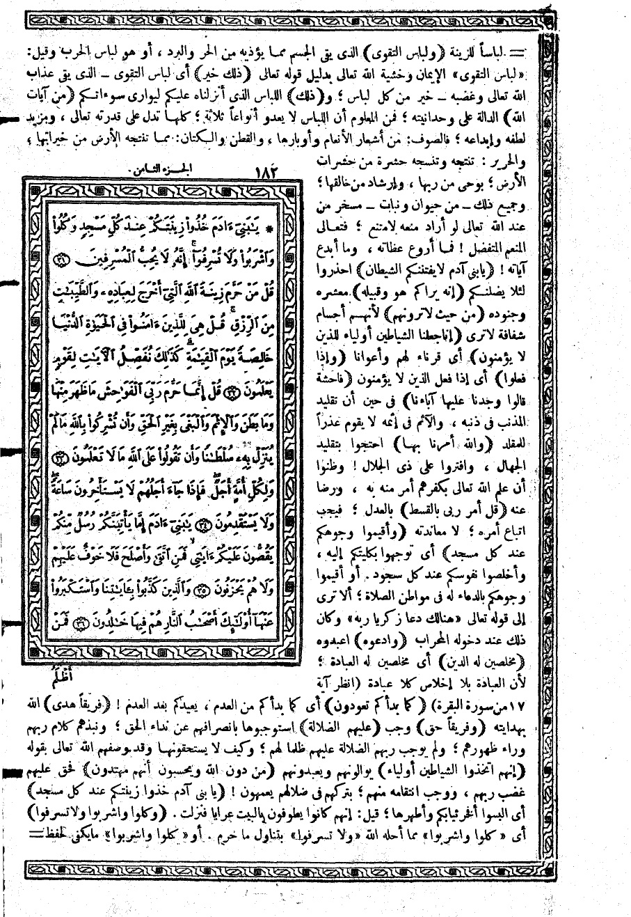 {يَابَنِي آدَمَ خُذُواْ زِينَتَكُمْ عِندَ كُلِّ مَسْجِدٍ} أي البسوا أفخر ثيابكم وأطهرها؛ قيل: إنهم كانوا يطوفون بالبيت عرايا فنزلت. {وكُلُواْ وَاشْرَبُواْ وَلاَ تُسْرِفُواْ} أي {كُلُواْ وَاشْرَبُواْ} مما أحله الله {وَلاَ تُسْرِفُواْ} بتناول ما حرم. أو {كُلُواْ وَاشْرَبُواْ} ما يكفي لحفظ