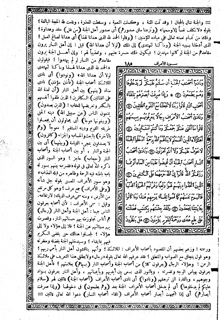 {وَبَيْنَهُمَا} أي بين الجنة والنار، أو بين أصحاب الجنة وأصحاب النار {حِجَابٍ} حاجز؛ وهو السور الذي ذكره الله تعالى في قوله {فَضُرِبَ بَيْنَهُم بِسُورٍ لَّهُ بَابٌ بَاطِنُهُ فِيهِ الرَّحْمَةُ وَظَاهِرُهُ مِن قِبَلِهِ الْعَذَابُ} وهو سور الأعراف المعني بقوله جل شأنه {وَعَلَى الأَعْرَافِ} جمع عرف؛ وهو كل مرتفع من الأرض، ومنه سمي عرف الديك: لارتفاعه. وقيل: سمي الأعراف: لأن أصحابه يعرفون الناس جميعاً: أهل الجنة وأهل النار {رِجَالٌ} هم أناس تجاوزت بهم حسناتهم النار، وقصرت بهم سيئاتهم عن الجنة؛ فلا إلى هؤلاء ولا إلى هؤلاء؛ فجعلوا هنالك حتى يقضي الكريم فيهم بما يشاء؛ وسيدخلهم الجنة بفضله ومغفرته ورحمته وزعم بعضهم أن المقصود بأصحاب الأعراف: الملائكة؛ وأنهم يناقشون أهل النار بأمر ربهم؛ وهو قول يتجافى مع الصواب والمنطق؛ فقد عرفهم الله تعالى بقوله {رِجَالٌ} ولا يطلق هذا التعريف على ملائكة الرحمن وهؤلاء الرجال {يَعْرِفُونَ كُلاًّ} من أصحاب الجنة وأصحاب النار {بِسِيمَاهُمْ} بعلامتهم؛ فأهل الجنة يعرفون ببياض الوجه ونضرته، وبالنور الذي يسعى بين أيديهم وبأيمانهم، وأهل النار يعرفون بسواد وجوههم، وبالقترة التي ترهقهم {وَنَادَوْاْ} أي نادى أصحاب الأعراف {أَصْحَابَ الْجَنَّةِ} قائلين لهم {سَلاَمٌ عَلَيْكُمْ لَمْ يَدْخُلُوهَا}