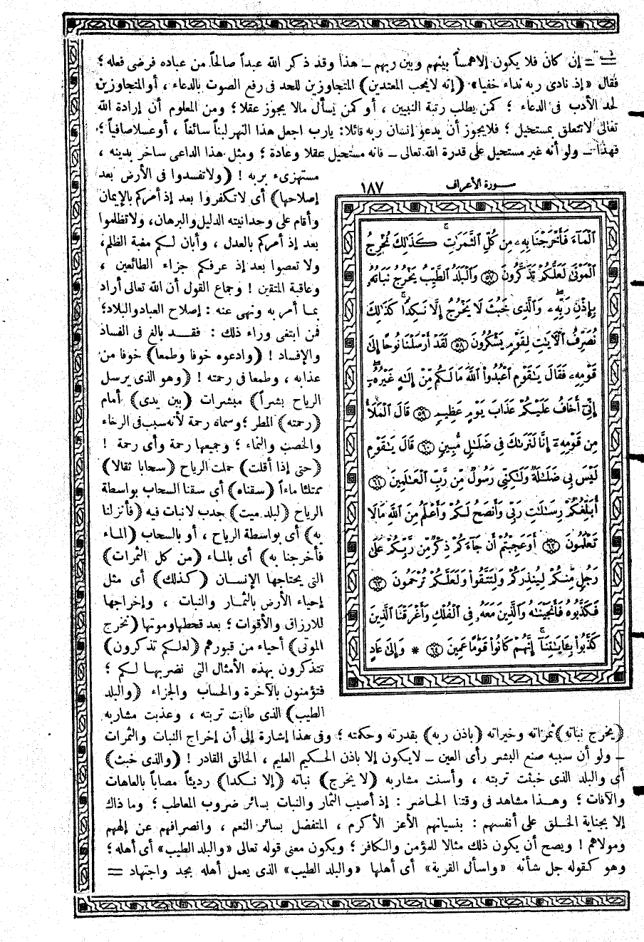 -[188]- في دينهم ودنياهم {يَخْرُجُ نَبَاتُهُ} أي ثواب إحسانهم وإيمانهم كثيراً غزيراً {بِإِذْنِ رَبِّهِ} بتفضله وإحسانه؛ وهو الجنة، وأنعم بها من منة {وَالَّذِي خَبُثَ} أي الذي خبث أهله، وساءت أعمالهم، وكفروا بربهم؛ وركنوا إلى الكسل والخمول {لاَ يَخْرُجُ} نباته {إِلاَّ نَكِداً} أي ثواب أعمالهم النار وبئس القرار ويجوز أن يكون المراد بالبلد: الجسد.