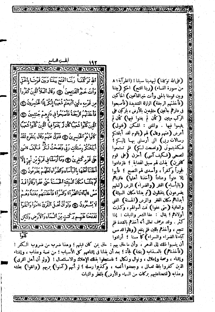 {وَلَوْ أَنَّ أَهْلَ الْقُرَى} الذين كفروا ب الله تعالى، وجحدوا أنعمه، وكذبوا رسله؛ لو أنهم {آمَنُواْ} بربهم {وَاتَّقَواْ} بطشه وعذابه {لَفَتَحْنَا عَلَيْهِمْ بَرَكَاتٍ مِّنَ السَّمَآءِ وَالأَرْضِ} بالمطر والنبات. فانظر - يا رعاك الله - إلى قول مولاك {لَفَتَحْنَا عَلَيْهِمْ} ولم يقل: {أَنزَلْنَا عَلَيْهِمْ} وقال: {بَرَكَاتٍ} ولم يقل: {رِزْقاً} وشتان بين الفتح والإنزال، البركات والأرزاق فالمطر وحده لا يكفل الخصب والإنبات أما البركات فهي وحدها كفيلة بكل شيء.