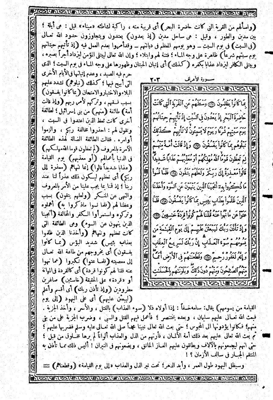 {وَسْئَلْهُمْ عَنِ الْقَرْيَةِ الَّتِي كَانَتْ حَاضِرَةَ الْبَحْرِ} أي قريبة منه، راكبة لشاطئه «ميناء» قيل: هي أيلة؛ بين مدين والطور، وقيل: هي ساحل مدين {إِذْ يَعْدُونَ} يعتدون ويتجاوزون حدود الله تعالى {فِي السَّبْتِ} في يوم السبت - وهو يومهم المعظم في ديانتهم - وقد أمروا بعدم العمل فيه {إِذْ تَأْتِيهِمْ حِيتَانُهُمْ يَوْمَ سَبْتِهِمْ شُرَّعاً} ظاهرة على وجه الماء؛ فتنة لهم وابتلاء؛ وإن الله تعالى ليبتلي المؤمن ليزداد أجراً بصبره، ويبتلي الكافر ليزداد عذاباً بكفره {كَذلِكَ} أي إتيان الحيتان وظهورها على وجه الماء في يوم السبت؛ الذي حرم فيه الصيد، وعدم إتيانها في الأيام الأخرى التي أبيح فيها؛ كذلك {نَبْلُوهُم} نشدد عليهم البلاء والاختبار والامتحان {بِمَا كَانُواْ يَفْسُقُونَ} بسبب فسقهم، وتركهم لأمر ربهم