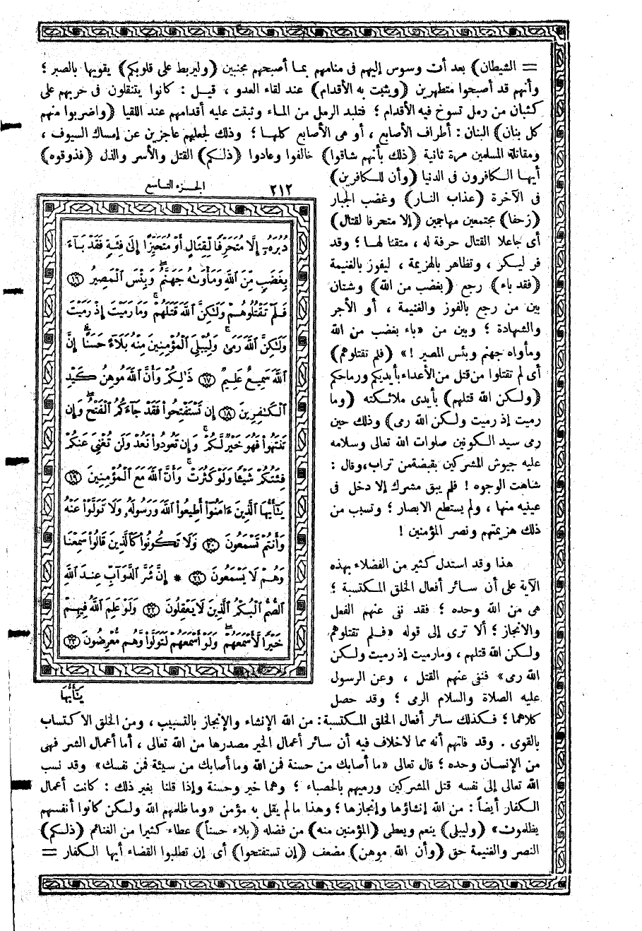 هذا وقد استدل كثير من الفضلاء بهذه الآية على أن سائر أفعال الخلق المكتسبة؛ هي من الله وحده؛ فقد نفي عنهم الفعل والإنجاز؛ ألا ترى إلى قوله: {فَلَمْ تَقْتُلُوهُمْ وَلَكِنَّ اللَّهَ قَتَلَهُمْ وَمَا رَمَيْتَ إِذْ رَمَيْتَ وَلَكِنَّ اللَّهَ رَمَى} فنفى عنهم القتل، وعن الرسول عليه الصلاة والسلام الرمي؛ وقد حصل كلاهما؛ فكذلك سائر أفعال الخلق المكتسبة: من الله الإنشاء والإنجاز بالتسبيب، ومن الخلق الاكتساب بالقوى. وقد فاتهم أنه مما لا خلاف فيه أن سائر أعمال الخير مصدرها من الله تعالى، أما أعمال الشر فهي من الإنسان وحده؛ قال تعالى: {مَّآ أَصَابَكَ مِنْ حَسَنَةٍ فَمِنَ اللَّهِ وَمَآ أَصَابَكَ مِن سَيِّئَةٍ فَمِن نَّفْسِكَ} وقد نسب الله تعالى إلى نفسه قتل المشركين ورميهم بالحصباء؛ وهما خير وحسنة وإذا قلنا بغير ذلك: كانت أعمال الكفار أيضاً: من الله إنشاؤها وإنجازها؛ وهذا ما لم يقل به مؤمن {وَمَا ظَلَمَهُمُ اللَّهُ وَلكِن كَانُواْ أَنْفُسَهُمْ يَظْلِمُونَ} {وَلِيُبْلِيَ} ينعم ويعطي {الْمُؤْمِنِينَ مِنْهُ} من فضله {بَلاءً حَسَناً} عطاءً كثيراً من الغنائم {ذلِكُمْ} النصر والغنيمة حق {وَأَنَّ اللَّهَ مُوهِنُ} مضعف