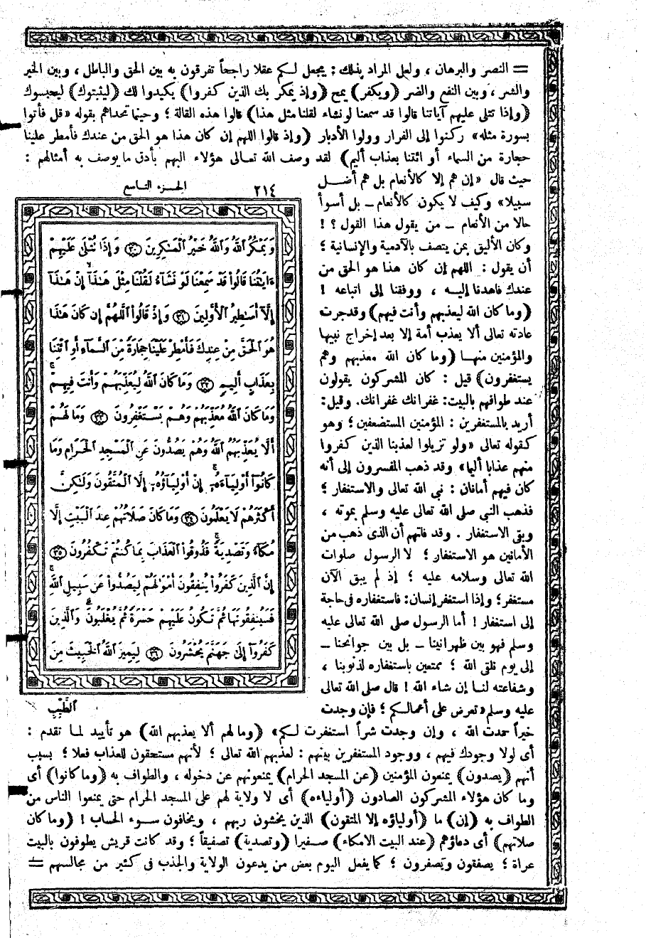 {وَمَا كَانَ اللَّهُ لِيُعَذِّبَهُمْ وَأَنتَ فِيهِمْ} وقد جرت عادته تعالى ألا يعذب أمة إلا بعد إخراج نبيها والمؤمنين منها {وَمَا كَانَ اللَّهُ مُعَذِّبَهُمْ وَهُمْ يَسْتَغْفِرُونَ} قيل: كان المشركون يقولون عند طوافهم بالبيت: غفرانك غفرانك. وقيل: أريد بالمستغفرين: المؤمنين المستضعفين؛ وهو كقوله تعالى: {لَوْ تَزَيَّلُواْ لَعَذَّبْنَا الَّذِينَ كَفَرُواْ مِنْهُمْ عَذَاباً أَلِيماً} وقد ذهب المفسرون إلى أنه كان فيهم أمانان: نبي الله تعالى والاستغفار؛ فذهب النبي بموته، وبقي الاستغفار. وقد فاتهم أن الذي ذهب من الأمانين هو الاستغفار؛ لا الرسول صلوات الله تعالى وسلامه عليه؛ إذ لم يبق الآن مستغفر؛ وإذا استغفر إنسان: فاستغفاره في حاجة إلى استغفار أما الرسول فهو بين ظهرانينا - بل بين جوانحنا - إلى يوم نلقى الله؛ ممتعين باستغفاره لذنوبنا، وشفاعته لنا إن شاء الله قال: «تعرض علي أعمالكم؛ فإن وجدت خيراً حمدت الله، وإن وجدت شراً استغفرت لكم»