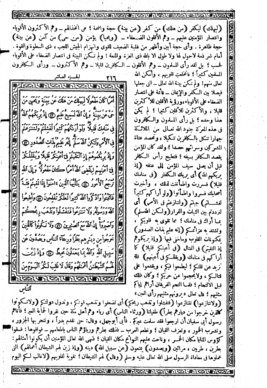 -[217]- مِنَ النَّاسِ} وقد ظهر لهم الشيطان على صورة سيد الناحية التي تم فيها القتال {وَإِنِّي جَارٌ} أي مجير {لَّكُمْ فَلَمَّا تَرَآءَتِ الْفِئَتَانِ} تلاقى الجمعان {نَكَصَ} رجع الشيطان {عَلَى عَقِبَيْهِ} هارباً {وَقَالَ} وذلك حين رأى إبليس اللعين، الملائكة المقربين؛ يضربون الكفار مع المسلمين؛ فقال: {إِنَّي أَرَى} بعيني رأسي {مَا لاَ تَرَوْنَ} أنتم {إِنَّي أَخَافُ اللَّهَ} كذب اللعين في هذا القول؛ ولكنه قاله حينما رأى ألا حول له ولا قوة في هذا اليوم: فركن إلى الفرار، وولى الأدبار