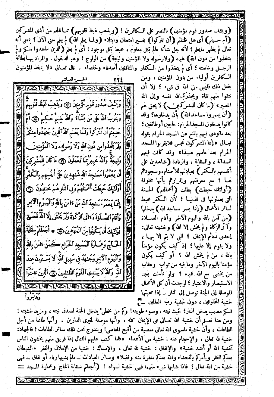 -[225]- الْحَرَامِ كَمَنْ آمَنَ بِاللَّهِ وَالْيَوْمِ الآخِرِ وَجَاهَدَ فِي سَبِيلِ اللَّهِ} قيل: افتخر العباس بالسقاية، وشيبة بالعمارة، وعلي رضي الله تعالى عنه بالإسلام والجهاد؛ فصدق الله تعالى علياً؛ لأن