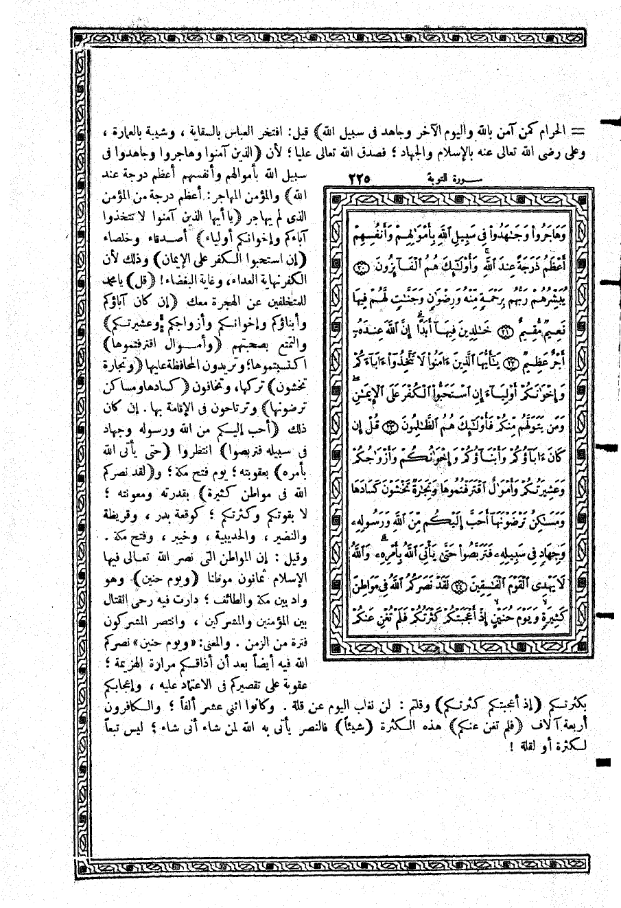 {لَقَدْ نَصَرَكُمُ اللَّهُ فِي مَوَاطِنَ كَثِيرَةٍ} بقدرته ومعونته؛ لا بقوتكم وكثرتكم؛ كوقعة بدر، وقريظة والنضير، والحديبية، وخيبر، وفتح مكة. وقيل: إن المواطن التي نصر الله تعالى فيها الإسلام ثمانون موطناً {وَيَوْمَ حُنَيْنٍ} وهو وادٍ بين مكة والطائف؛ دارت فيه رحى القتال بين المؤمنين والمشركين، وانتصر المشركون فترة من الزمن. والمعنى: «ويوم حنين» نصركم الله فيه أيضاً بعد أن أذاقكم مرارة الهزيمة؛ عقوبة على تقصيركم في الاعتماد عليه، وإعجابكم بكثرتكم {إِذْ أَعْجَبَتْكُمْ كَثْرَتُكُمْ} وقلتم: لن نغلب اليوم عن قلة. وكانوا اثني عشر ألفاً؛ والكافرون أربعة آلاف {فَلَمْ تُغْنِ عَنكُمْ} هذه الكثرة {شَيْئاً} فالنصر يأتي به الله لمن شاء أنى شاء؛ ليس تبعاً لكثرة أو لقلة