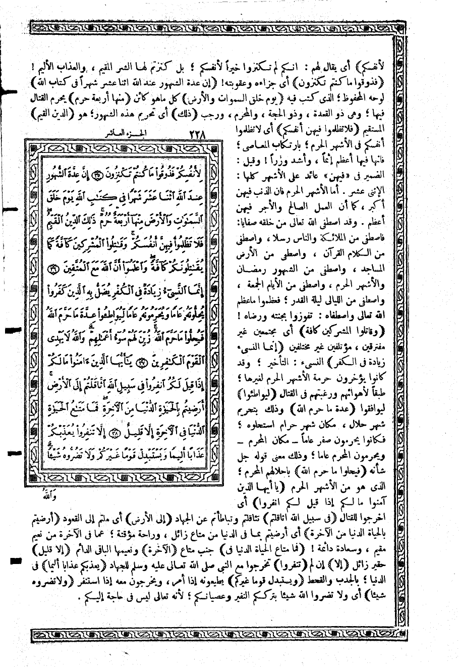 {إِنَّ عِدَّةَ الشُّهُورِ عِندَ اللَّهِ اثْنَا عَشَرَ شَهْراً فِي كِتَابِ اللَّهِ} لوحه المحفوظ؛ الذي كتب فيه {يَوْمَ خَلَقَ السَّمَاوَات وَالأَرْضَ} كل ما هو كائن {مِنْهَآ أَرْبَعَةٌ حُرُمٌ} يحرم القتال فيها وهي: ذو القعدة، وذو الحجة، والمحرم، ورجب {ذلِكَ} أي تحريم هذه الشهور؛ هو {الدِّينُ الْقَيِّمُ} المستقيم {فَلاَ تَظْلِمُواْ فِيهِنَّ أَنْفُسَكُمْ} أي لا تظلموا أنفسكم في الأشهر الحرم؛ بارتكاب المعاصي؛ فإنها فيها أعظم إثماً، وأشد وزراً وقيل: الضمير في «فيهن» عائد على الأشهر كلها: الإثني عشر. أما الأشهر الحرم فإن الذنب فيهن أكبر، كما أن العمل الصالح والأجر فيهن أعظم. وقد اصطفى الله تعالى من خلقه صفايا: فاصطفى من الملائكة والناس رسلاً، واصطفى من الكلام القرآن، واصطفى من الأرض المساجد، واصطفى من الشهور رمضان والأشهر الحرم، واصطفى من الأيام الجمعة، واصطفى من الليالي ليلة القدر؛ فعظموا ما عظم الله تعالى واصطفاه: تفوزوا بجنته ورضاه {وَقَاتِلُواْ الْمُشْرِكِينَ كَآفَّةً} أي مجتمعين غير مفترقين، مؤتلفين غير مختلفين