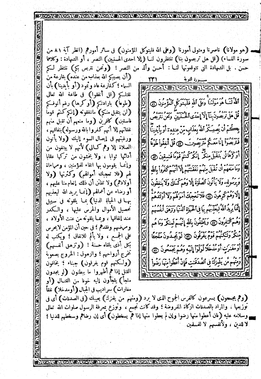 {قُلْ هَلْ تَرَبَّصُونَ بِنَآ} تنتظرون لنا {إِلاَّ إِحْدَى الْحُسْنَيَيْنِ} النصر، أو الشهادة: وكلاهما حسن. بل الشهادة التي تتوقعونها لنا: أحسن وألذ من النصر {وَنَحْنُ نَتَرَبَّصُ بِكُمْ} ننتظر لكم {أَن يُصِيبَكُمُ اللَّهُ بِعَذَابٍ مِّنْ عِندِهِ} بقارعة من السماء؛ كقارعة عاد وثمود {أَوْ بِأَيْدِينَا} بأن نقتلكم