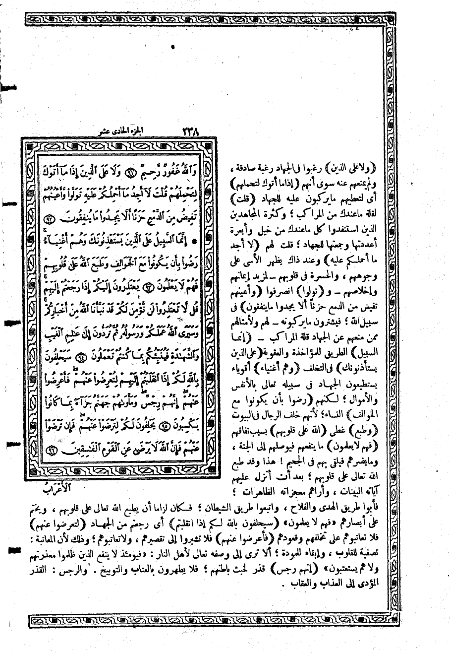 {إِنَّمَا السَّبِيلُ} الطريق للمؤاخذة والعقوبة {عَلَى الَّذِينَ يَسْتَأْذِنُونَكَ} في التخلف {وَهُمْ أَغْنِيَآءُ} أقوياء يستطيعون الجهاد في سبيله تعالى بالأنفس والأموال؛ لكنهم {رَضُواْ بِأَن يَكُونُواْ مَعَ الْخَوَالِفِ} النساء؛ لأنهم خلف الرجال في البيوت {وَطَبَعَ} غطى {اللَّهُ عَلَى قُلُوبِهِمْ} بسبب نفاقهم {فَهُمْ لاَ يَعْلَمُونَ} ما ينفعهم فيوصلهم إلى الجنة، وما يضرهم فيلقي بهم في الجحيم هذا وقد طبع الله تعالى على قلوبهم؛ بعد أن أنزل عليهم آياته البينات، وأراهم معجزاته الظاهرات؛ فأبوا طريق الهدى والفلاح، واتبعوا طريق الشيطان؛ فكان لزاماً أن يطبع الله تعالى على قلوبهم، ويختم على أبصارهم {فَهُمْ لاَ يَعْلَمُونَ}