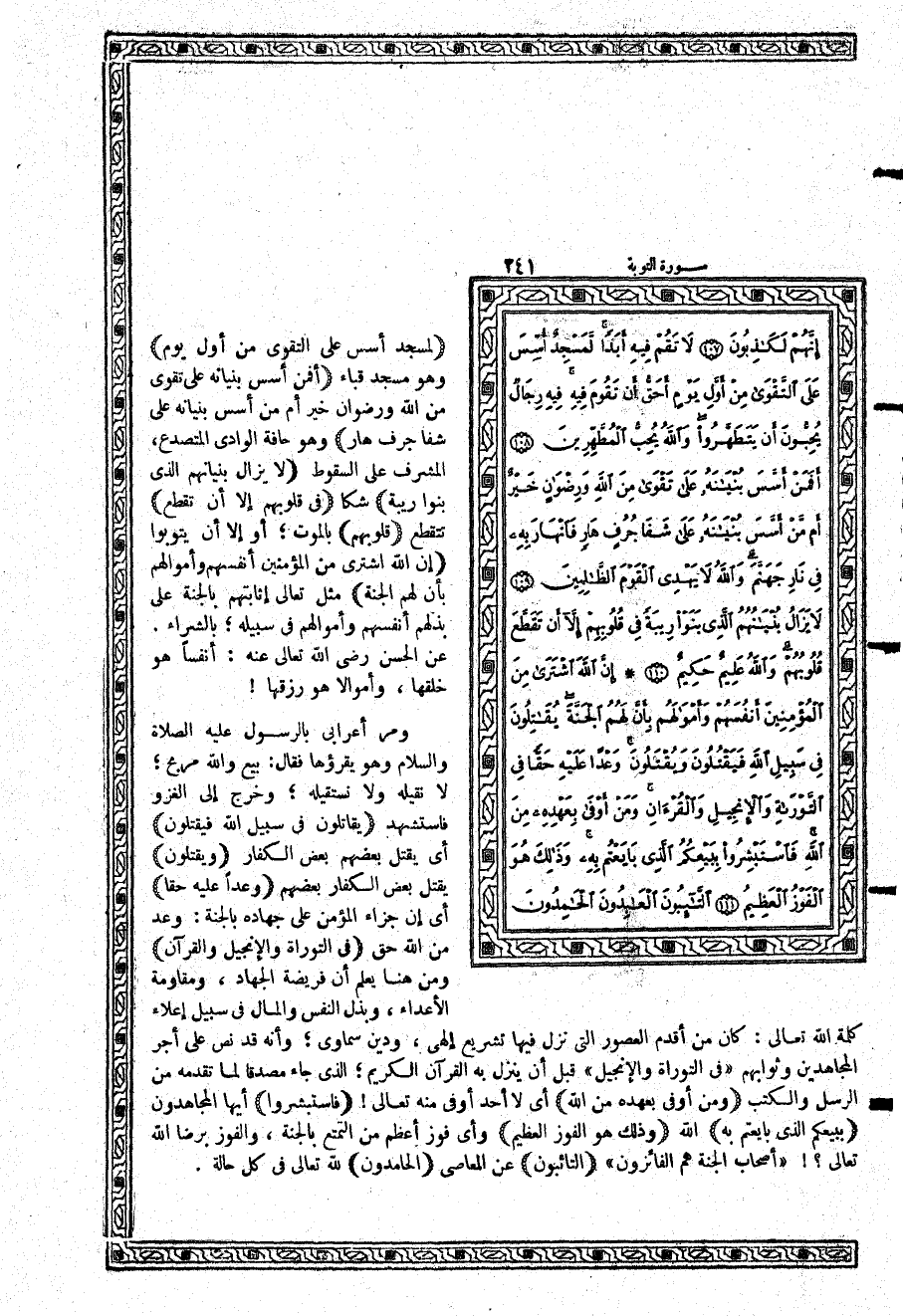 ومر أعرابي بالرسول عليه الصلاة والسلام وهو يقرؤها فقال: بيع والله مربح؛ لا نقيله ولا نستقيله؛ وخرج إلى الغزو فاستشهد {يُقَاتِلُونَ فِي سَبِيلِ اللَّهِ فَيَقْتُلُونَ} أي يقتل بعضهم بعض الكفار {يُقَاتِلُونَ} يقتل بعض الكفار بعضهم {وَعْداً عَلَيْهِ حَقّاً} أي إن جزاء المؤمن على جهاده بالجنة: وعد من الله حق {فِي التَّوْرَاةِ وَالإِنْجِيلِ وَالْقُرْآنِ} ومن هنا يعلم أن فريضة الجهاد، ومقاومة الأعداء، وبذل النفس والمال في سبيل إعلاء كلمة الله تعالى: كان من أقدم العصور التي نزل فيها تشريع إلهي، ودين سماوي؛ وأنه قد نص على أجر المجاهدين وثوابهم {فِي التَّوْرَاةِ وَالإِنْجِيلِ} قبل أن ينزل به القرآن الكريم؛ الذي جاء مصدقاً لما تقدمه من الرسل والكتب {وَمَنْ أَوْفَى بِعَهْدِهِ مِنَ اللَّهِ} أي لا أحد أوفى منه تعالى {فَاسْتَبْشِرُواْ} أيها المجاهدون {بِبَيْعِكُمُ الَّذِي بَايَعْتُمْ بِهِ} الله {وَذَلِكَ هُوَ الْفَوْزُ الْعَظِيمُ} وأي فوز أعظم من التمتع بالجنة، والفوز برضا الله تعالى؟ {أَصْحَابُ الْجَنَّةِ هُمُ الْفَآئِزُونَ}