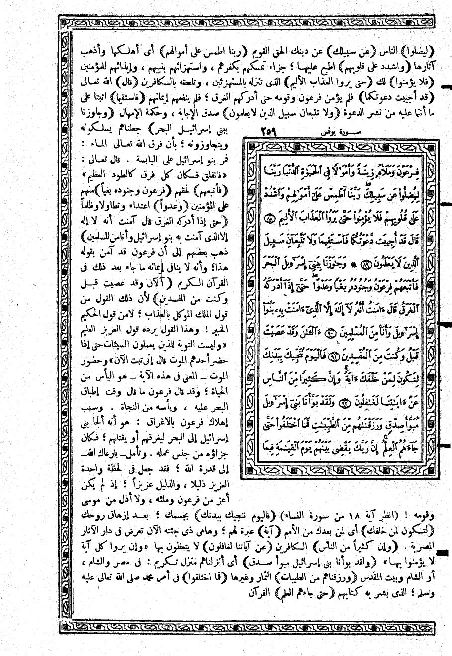 {وَجَاوَزْنَا بِبَنِي إِسْرَائِيلَ الْبَحْرَ} جعلناهم يسلكونه ويتجاوزونه؛ بأن فرق الله تعالى الماء: فمر بنو إسرائيل على اليابسة. قال تعالى: {فَانفَلَقَ فَكَانَ كُلُّ فِرْقٍ كَالطَّوْدِ الْعَظِيمِ} {فَأَتْبَعَهُمْ} لحقهم {فِرْعَوْنُ وَجُنُودُهُ بَغْياً} منهم على المؤمنين {وَعَدْواً} اعتداء وتطاولاً وظلماً {حَتَّى إِذَآ أَدْرَكَهُ الْغَرَقُ قَالَ آمَنتُ أَنَّهُ لا إِلِهَ إِلاَّ الَّذِي آمَنَتْ بِهِ بَنواْ إِسْرَائِيلَ وَأَنَاْ مِنَ الْمُسْلِمِينَ} ذهب بعضهم إلى أن فرعون قد آمن بقوله هذا؛ وأنه لا ينافي إيمانه ما جاء بعد ذلك في القرآن الكريم