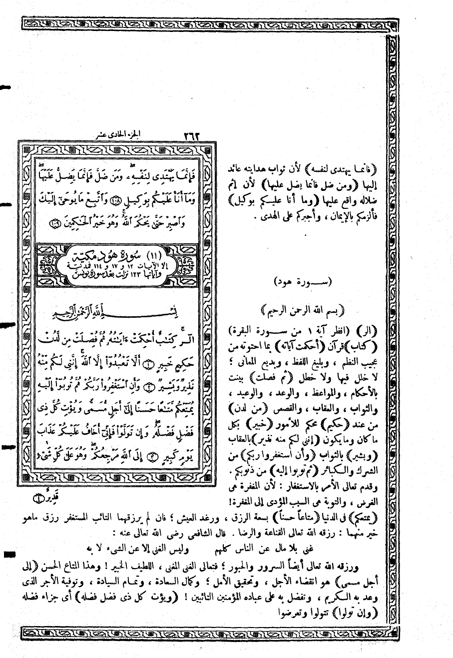 {الر} (انظر آية صلى الله عليه وسلّم من سورة البقرة) {كِتَابٌ} قرآن {أُحْكِمَتْ آيَاتُهُ} بما احتوته من عجيب النظم، وبليغ اللفظ، وبديع المعاني؛ لا خلل فيها ولا خطل {ثُمَّ فُصِّلَتْ} بينت بالأحكام، والمواعظ، والوعد، والوعيد، والثواب والعقاب، والقصص {مِن لَّدُنْ} من عند {حَكِيمٍ} محكم للأمور {خَبِيرٍ} بكل ما كان وما يكون