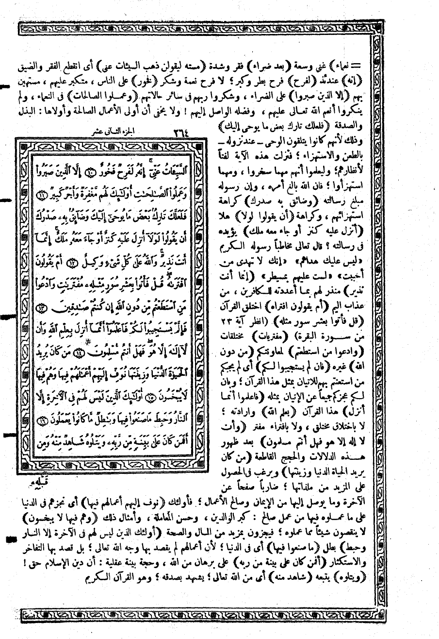 -[265]- {وَمِن قَبْلِهِ كِتَابُ مُوسَى} التوراة {إَمَاماً} الإمام: الجامع للخير، المقيم على الحق {أُوْلَئِكَ} أي الذين هم على بينة من ربهم {يُؤْمِنُونَ بِهِ} أي بالقرآن {وَمَن يَكْفُرْ بِهِ مِنَ الأَحْزَابِ} من الكفار؛ وسموا أحزاباً: لأنهم تحزبوا على معاداة الرسول {فَلاَ تَكُ فِي مِرْيَةٍ} شك