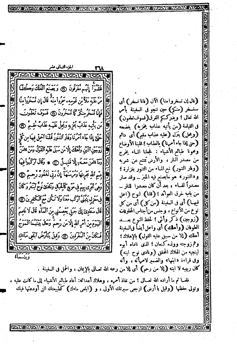 {حَتَّى إِذَا جَآءَ أَمْرُنَا} بالعذاب؛ قلبنا الأوضاع ومحونا طبائع الأشياء: فجعلنا الماء يخرج من مصدر النار، والأرض تمتنع عن شربه {وَفَارَ التَّنُّورُ} نبع الماء من التنور بغزارة؛ و «التنور» هو ما يصنع فيه الخبز - وقد صار مصدراً للماء، بعد أن كان مصدراً للنار - من باب خرق العوائد {قُلْنَا} لنوح {احْمِلْ فِيهَا} أي في السفينة {مِن كُلٍّ} أي من كل نوع من الأنواع، وجنس من أجناس المخلوقات {زَوْجَيْنِ} ذكر وأنثى؛ لحفظ النوع بعد الطوفان {وَأَهْلَكَ} أي واحمل أيضاً في السفينة أهلك {إِلاَّ مَن سَبَقَ عَلَيْهِ الْقَوْلُ} بالإهلاك؛ وهم زوجته وولده كنعان؛ الذي ناداه أبوه لينجيه من الهلاك المحقق