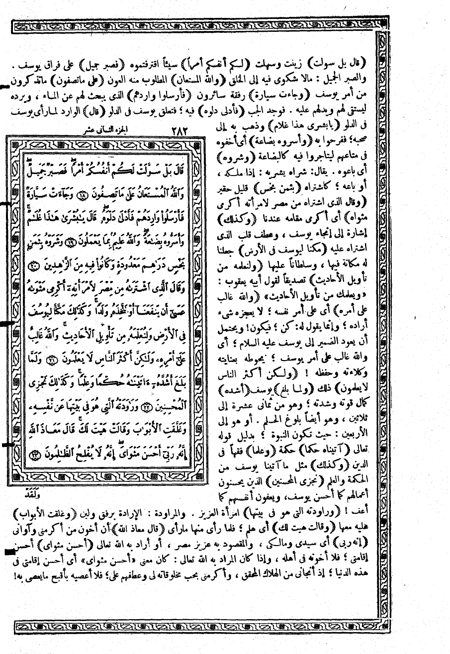 {وَرَاوَدَتْهُ الَّتِي هُوَ فِي بَيْتِهَا} امرأة العزيز: والمراودة: الإرادة برفق ولين {وَغَلَّقَتِ الأَبْوَابَ} عليه معها {وَقَالَتْ هَيْتَ لَكَ} أي هلم؛ فلما رأى منها ما رأى {قَالَ مَعَاذَ اللَّهِ} أن أخون من أكرمني وآواني {إِنَّهُ رَبِّي} أي سيدي ومالكي، والمقصود به عزيز مصر، أو أراد به الله تعالى {أَحْسَنَ مَثْوَايَ} أحسن إقامتي؛ فلا أخونه في أهله، وإذا كان المراد به الله تعالى: كان معنى «أحسن مثواي» أي أحسن إقامتي في هذه الدنيا؛ إذ أنجاني من الهلاك المحقق، وأكرمني بحب مخلوقاته لي وعطفهم عليَّ؛ فلا أعصيه بأقبح ما يعصى به