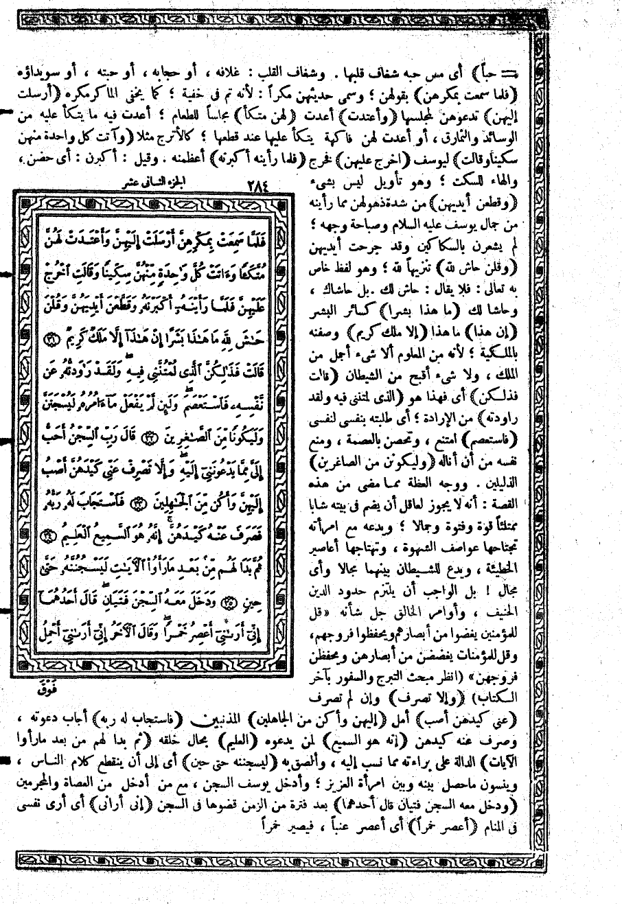 {أَرْسَلَتْ إِلَيْهِنَّ} تدعوهن لمجلسها {وَأَعْتَدَتْ} أعدت {لَهُنَّ مُتَّكَئاً} مجلساً للطعام؛ أعدت فيه ما يتكأ عليه من الوسائد والنمارق، أو أعدت لهن فاكهة يتكأ عليها عند قطعها؛ كالأترج مثلاً {وَآتَتْ كُلَّ وَاحِدَةٍ مِّنْهُنَّ سِكِّيناً وَقَالَتِ} ليوسف {اخْرُجْ عَلَيْهِنَّ} فخرج {فَلَمَّا رَأَيْنَهُ أَكْبَرْنَهُ} أعظمنه. وقيل: أكبرن: أي حضن، والهاء للسكت؛ وهو تأويل ليس بشيء {وَقَطَّعْنَ أَيْدِيَهُنَّ} من شدة ذهولهن مما رأينه من جمال يوسف عليه السلام وصباحة وجهه؛ لم يشعرن بالسكاكين وقد جرحت أيديهن {وَقُلْنَ حَاشَ للَّهِ} تنزيهاً لله؛ وهو لفظ خاص به تعالى: فلا يقال: حاش لك، بل حاشاك، وحاشا لك