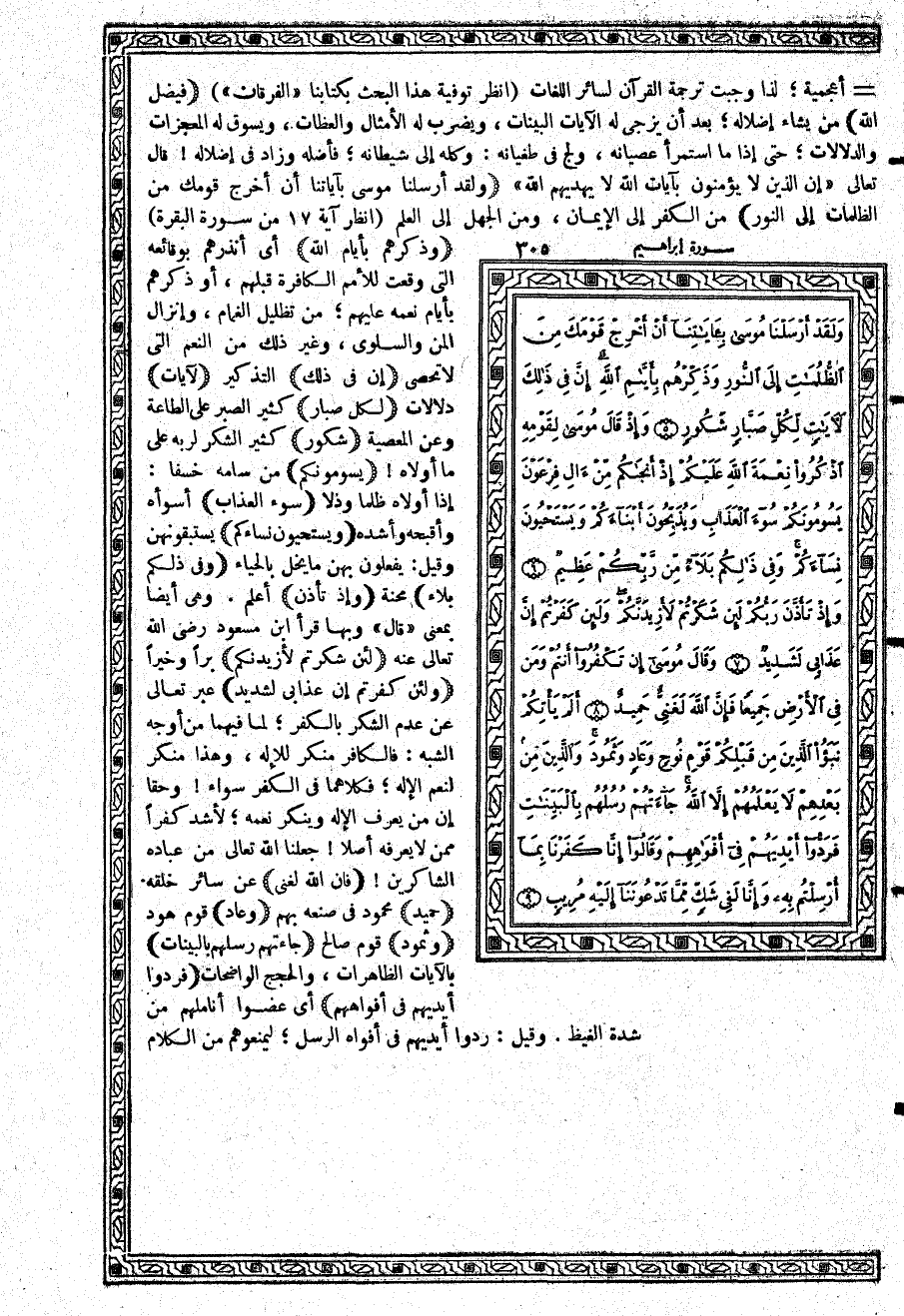{وَلَقَدْ أَرْسَلْنَا مُوسَى بِآيَاتِنَآ أَنْ أَخْرِجْ قَوْمَكَ مِنَ الظُّلُمَاتِ إِلَى النُّورِ} من الكفر إلى الإيمان، ومن الجهل إلى العلم (انظر آية 17 من سورة البقرة) {وَذَكِّرْهُمْ بِأَيَّامِ اللَّهِ} أي أنذرهم بوقائعه التي وقعت للأمم الكافرة قبلهم، أو ذكرهم بأيام نعمه عليهم؛ من تظليل الغمام، وإنزال المن والسلوى، وغير ذلك من النعم التي لا تحصى {إِنَّ فِي ذَلِكَ} التذكير {لآيَاتٍ} دلالات {لِّكُلِّ صَبَّارٍ} كثير الصبر على الطاعة وعن المعصية {شَكُورٍ} كثير الشكر لربه على ما أولاه