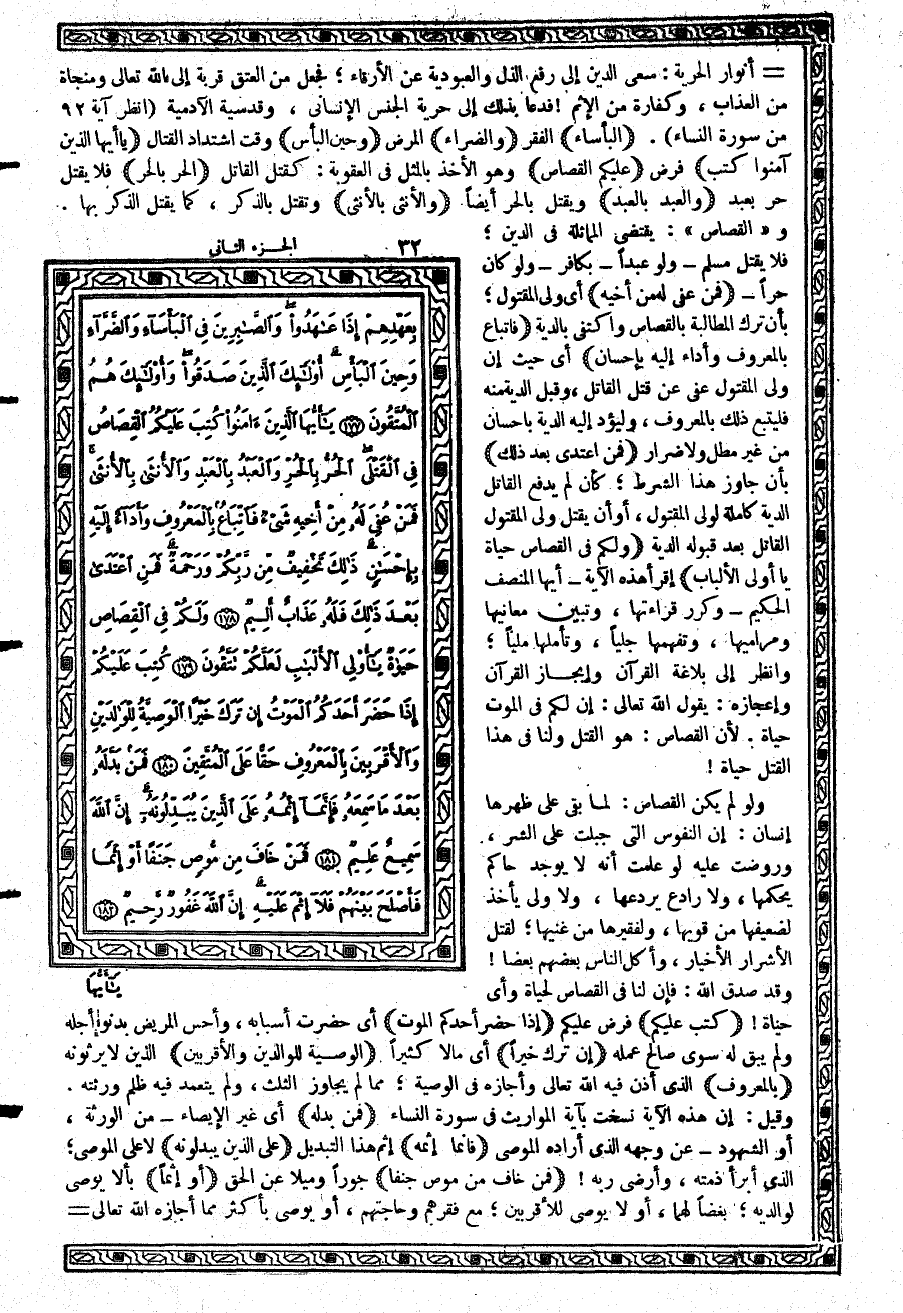 {يأَيُّهَا الَّذِينَ آمَنُواْ كُتِبَ} فرض {عَلَيْكُمُ الْقِصَاصُ} وهو الأخذ بالمثل في العقوبة: كقتل القاتل {الْحُرُّ بِالْحُرِّ} فلا يقتل حر بعبد {وَالْعَبْدُ بِالْعَبْدِ} ويقتل بالحر أيضاً {وَالأُنثَى بِالأُنْثَى} وتقتل بالذكر، كما يقتل الذكر بها. و «القصاص»: يقتضي المماثلة في الدين؛ فلا يقتل مسلم - ولو عبداً - بكافر - ولو كان حراً - {فَمَنْ عُفِيَ لَهُ مِنْ أَخِيهِ} أي ولي المقتول؛ بأن ترك المطالبة بالقصاص واكتفى بالدية {فَاتِّبَاعٌ بِالْمَعْرُوفِ وَأَدَآءٌ إِلَيْهِ بِإِحْسَانٍ} أي حيث إن ولي المقتول عفى عن قتل القاتل، وقبل الدية منه فليتبع ذلك بالمعروف، وليؤد إليه الدية بإحسان من غير مطل ولا ضرار {فَمَنِ اعْتَدَى بَعْدَ ذلِكَ} بأن جاوز هذا الشرط؛ كأن لم يدفع القاتل الدية كاملة لولي المقتول، أو أن يقتل ولي المقتول القاتل بعد قبوله الدية