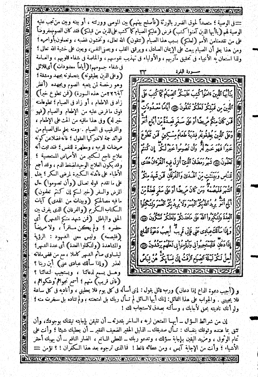 {يأَيُّهَا الَّذِينَ آمَنُواْ كُتِبَ} فرض {عَلَيْكُمُ الصِّيَامُ كَمَا كُتِبَ عَلَى الَّذِينَ مِن قَبْلِكُمْ} فقد كان الصوم مفروضاً على من تقدمنا من الأمم {لَعَلَّكُمْ} بسبب هذا الصيام {تَتَّقُونَ} الله تعالى، وتخشون غضبه، وتعملون بأوامره؛ ومن هذا يعلم أن الصيام يبعث على الإيمان الصادق، ويرقق القلب، ويصفي النفس، ويعين على خشية الله تعالى؛ ولذا استعان به الأنبياء في تحقيق مآربهم، والأولياء في تهذيب نفوسهم، والخاصة في شفاء قلوبهم، والعامة في شفاء جسومهم