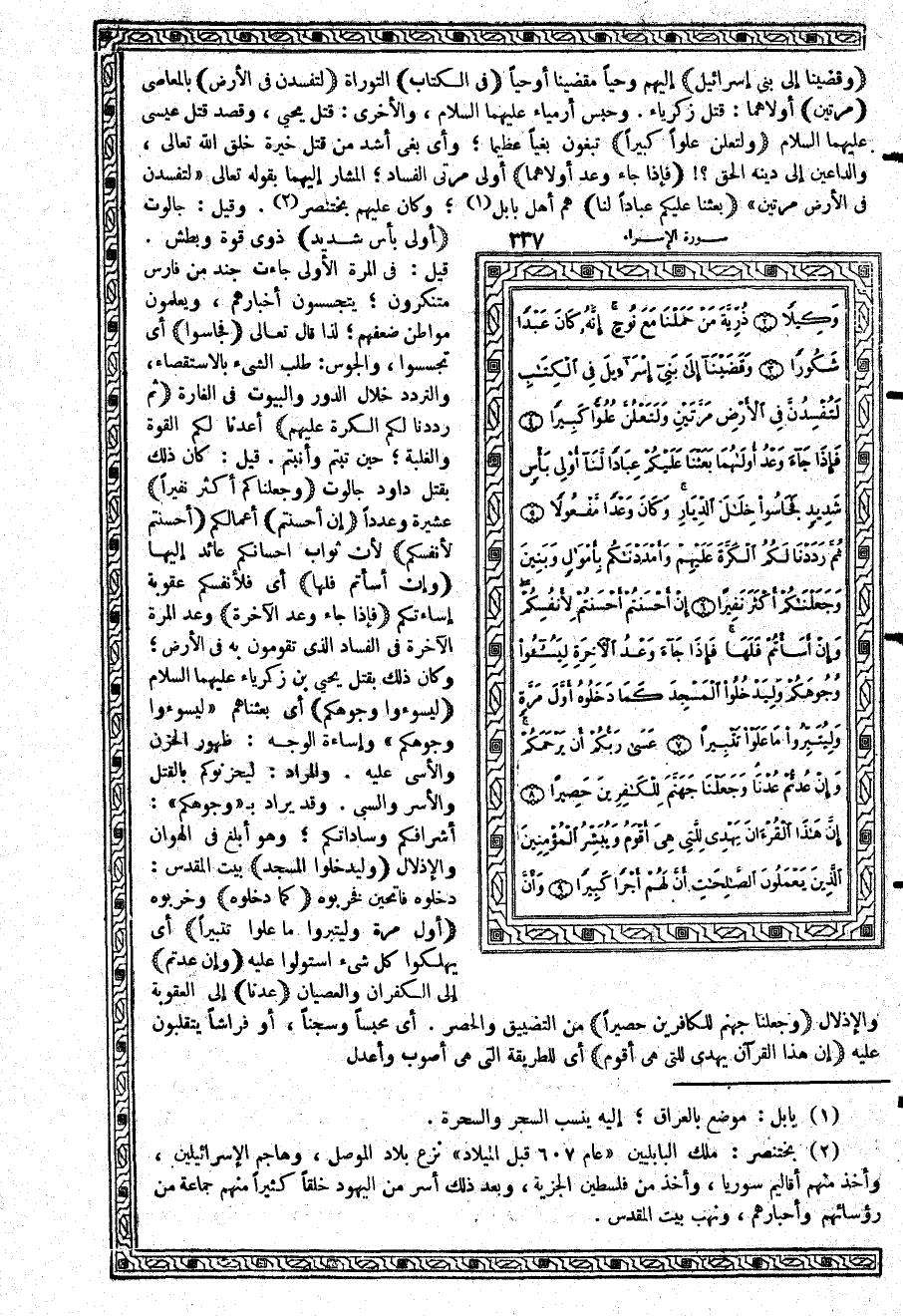 {وَقَضَيْنَآ إِلَى بَنِي إِسْرَائِيلَ} إليهم وحياً مقضيًّا أو حياً {فِي الْكِتَابِ} التوراة {لَتُفْسِدُنَّ فِي الأَرْضِ} بالمعاصي {مَّرَّتَيْنِ} أولاهما: قتل زكريا. وحبس أرمياء عليهما السلام، والأخرى: قتل يحيى، وقصد قتل عيسى عليهما السلام {وَلَتَعْلُنَّ عُلُوّاً كَبِيراً} تبغون بغياً عظيماً؛ وأي بغي أشد من قتل خيرة خلق الله تعالى، والداعين إلى دينه الحق؟