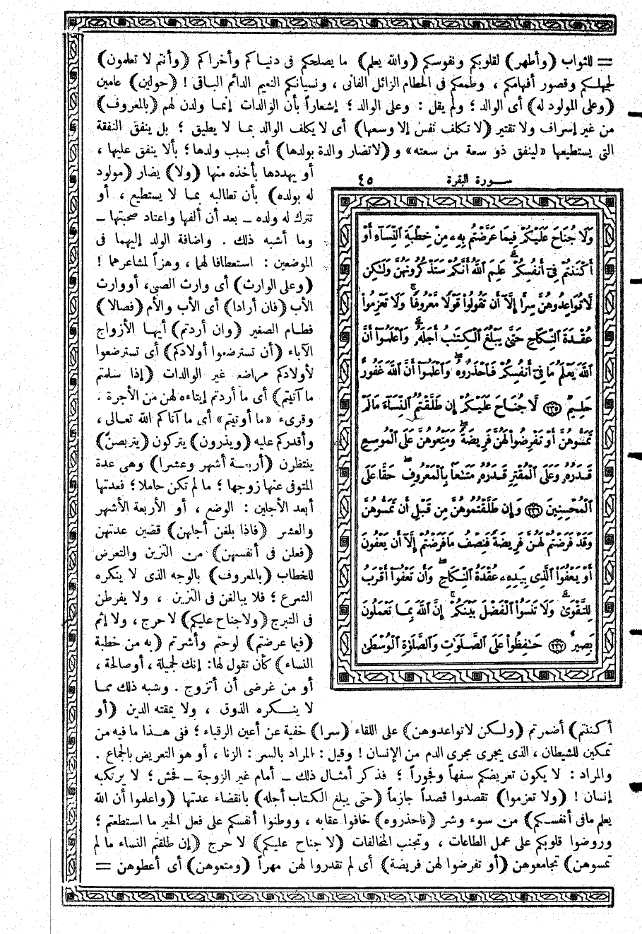 {وَلاَ جُنَاحَ عَلَيْكُمْ} لا حرج، ولا إثم {فِيمَا عَرَّضْتُمْ} لوحتم وأشرتم {بِهِ مِنْ خِطْبَةِ النِّسَآءِ} كأن تقول لها: إنك لجميلة، أو صالحة، أو من غرضي أن أتزوج. وشبه ذلك مما لا ينكره الذوق، ولا يمقته الدين {أَوْ أَكْنَنتُمْ} أضمرتم {وَلَكِن لاَّ تُوَاعِدُوهُنَّ} على اللقاء {سِرّاً} خفية عن أعين الرقباء؛ ففي هذا ما فيه من تمكين للشيطان الذي يجري مجرى الدم من الإنسان وقيل: المراد بالسر: الزنا، أو هو التعريض بالجماع. والمراد: لا يكون تعريضكم سفهاً وفجوراً؛ فذكر أمثال ذلك - أمام غير الزوجة - فحش؛ لا يرتكبه إنسان {وَلاَ تَعْزِمُواْ} تقصدوا قصداً جازماً {حَتَّى يَبْلُغَ الْكِتَابُ أَجَلَهُ} بانقضاء عدتها {وَاعْلَمُواْ أَنَّ اللَّهَ يَعْلَمُ مَا فِي أَنْفُسِكُمْ} من سوء وشر {فَاحْذَرُوهُ} خافوا عقابه، ووطنوا أنفسكم على فعل الخير ما استطعتم؛ وروضوا قلوبكم على عمل الطاعات، وتجنب المخالفات