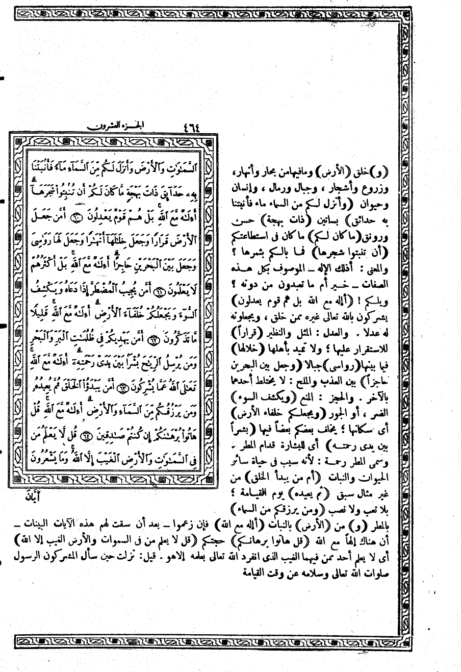 أَمَّن جَعَلَ الأَرْضَ قَرَاراً وَجَعَلَ خِلاَلَهَآ أَنْهَاراً وَجَعَلَ لَهَا رَوَاسِيَ وَجَعَلَ بَيْنَ الْبَحْرَيْنِ حَاجِزاً أَءِلَهٌ مَّعَ اللهِ بَلْ أَكْثَرُهُمْ لاَ يَعْلَمُونَ} يشركون ب الله تعالى غيره ممن خلق، ويجعلونه له عدلاً. والعدل: المثل والنظير {قَرَاراً} للاستقرار عليها؛ ولا تميد بأهلها {خِلاَلَهَآ} فيما بينها {رَوَاسِيَ} جبالاً {وَجَعَلَ بَيْنَ الْبَحْرَيْنِ حَاجِزاً} بين العذب والملح: لا يختلط أحدهما بالآخر. والحجز: المنع {وَيَكْشِفُ السُّوءَ} الضر، أو الجور {وَيَجْعَلُكُمْ حُلَفَآءَ الأَرْضِ} أي سكانها؛ يخلف بعضكم بعضاً فيها {بُشْرًى بَيْنَ يَدَيْ رَحْمَتِهِ} أي للبشارة قدام المطر. وسمي المطر رحمة: لأنه سبب في حياة سائر الحيوان والنبات
