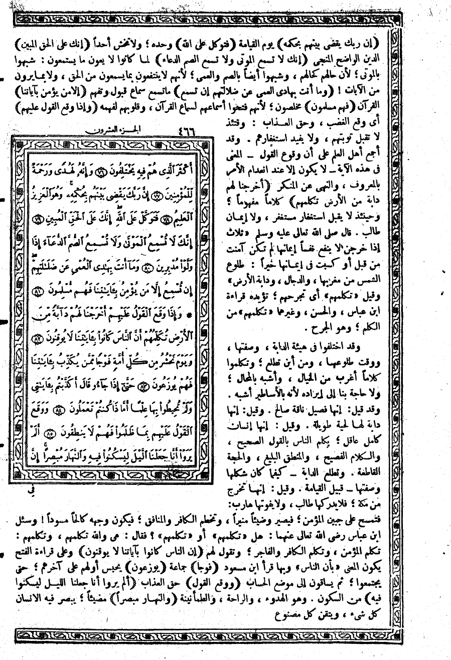 وقد اختلفوا في هيئة الدابة، وصفتها، ووقت طلوعها، ومن أين تطلع؛ وتكلموا كلاماً أغرب من الخيال، وأشبه بالمحال؛ ولا حاجة بنا إلى إيراده لأنه بالأساطير أشبه. وقد قيل: إنها فصيل ناقة صالح. وقيل: إنها دابة لها لحية طويلة. وقيل: إنها إنسان كامل عاقل؛ يكلم الناس بالقول الصحيح، والكلام الفصيح، والمنطق البليغ، والحجة القاطعة. وتطلع الدابة - كيفما كان شكلها وصفتها - قبيل القيامة. وقيل: إنها تخرج من مكة؛ فلا يدركها طالب، ولا يفوتها هارب: فتمسح على جبين المؤمن؛ فيصير وضيئاً منيراً، وتخطم الكافر والمنافق؛ فيكون وجهه كالحاً مسوداً وسئل ابن عباس رضي الله تعالى عنهما: هل «تكلمهم» أو «تكلمهم»؟ فقال: هي والله تكلمهم، وتكلمهم: تكلم المؤمن، وتكلم الكافر والفاجر؛ وتقول لهم: {أَنَّ النَّاسَ كَانُوا بِآيَاتِنَا لاَ يُوقِنُونَ} وعلى قراءة الفتح يكون المعنى «بأن الناس» وبها قرأ ابن مسعود