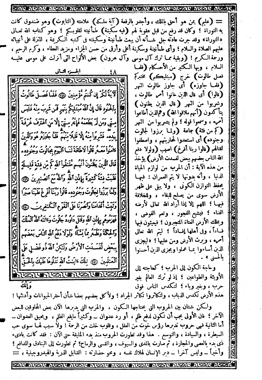 {وَلَوْلاَ دَفْعُ اللَّهِ النَّاسَ بَعْضَهُمْ بِبَعْضٍ لَفَسَدَتِ الأَرْضُ} يؤخذ من هذه الآية: أن الحرب من لوازم الحياة الدنيا، وأنه بدونها لا يتم العمران: فبها يحفظ التوازن الكوني، ولا يبقى على ظهر الأرض سوى من يصلح للبقاء، وللخلافة فيها؛ اللهم إلا إذا أراد الله تعالى لأرضه الفناء؛ فيشيع الفجور، وتعم الفوضى، ويملك الأرض العتاة المتجبرون؛ فيعيثون فيها فساداً، وفي أهلها إفساداً؛ ليتم الله تعالى أمره، ويرث الأرض ومن عليها؛ {لِيَجْزِيَ الَّذِينَ أَسَاءُواْ بِمَا عَمِلُواْ وَيِجْزِيَ الَّذِينَ أَحْسَنُواْ بِالْحُسْنَى}.