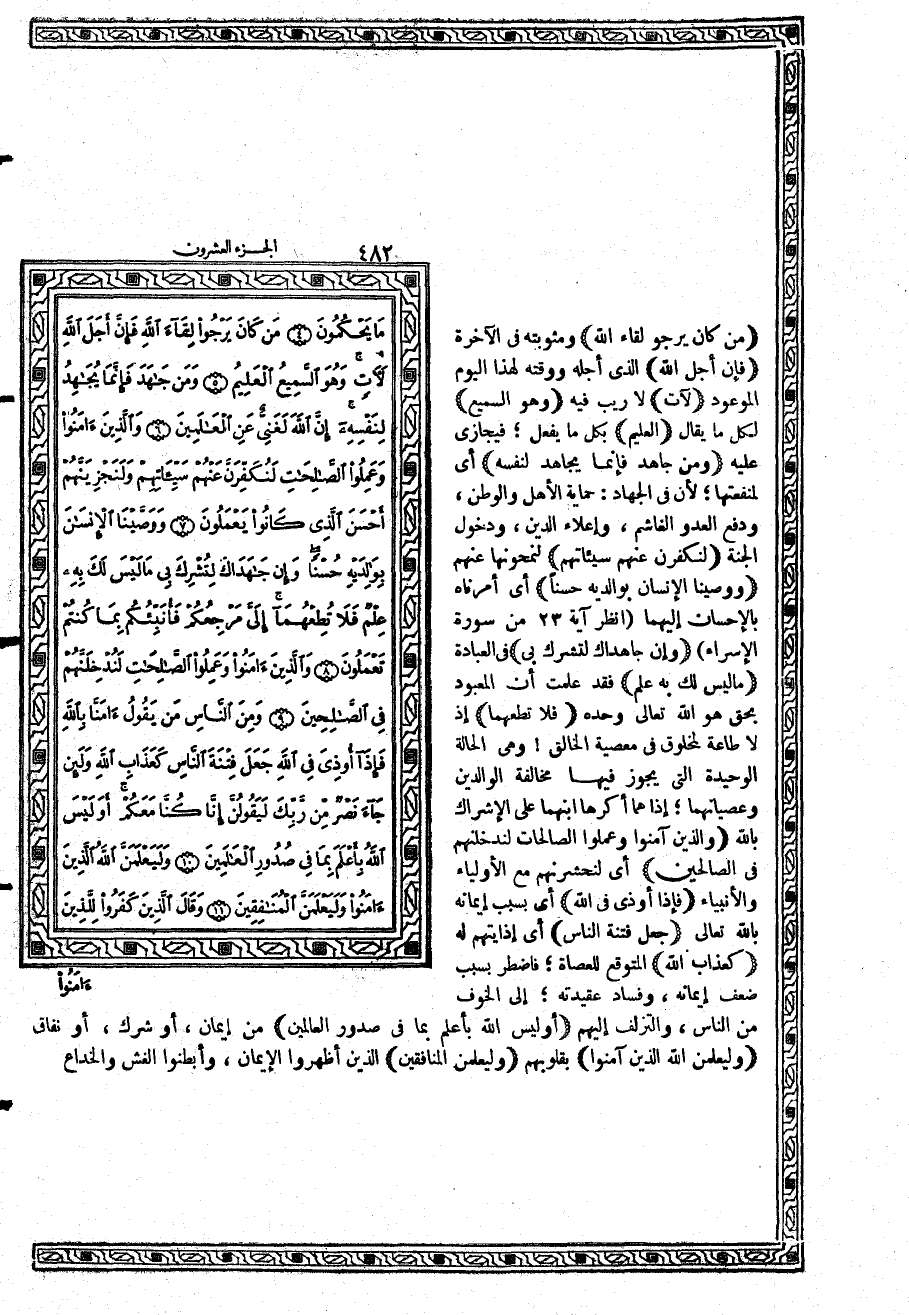 {وَوَصَّيْنَا الإِنْسَانَ بِوَالِدَيْهِ حُسْناً} أي أمرناه بالإحسان إليهما (انظر آية 23 من سورة الإسراء) {وَإِن جَاهَدَاكَ لِتُشْرِكَ بِي} في العبادة {مَا لَيْسَ لَكَ بِهِ عِلْمٌ} فقد علمت أن المعبود بحق هو الله تعالى وحده {فَلاَ تُطِعْهُمَآ} إذ لا طاعة لمخلوق في معصية الخالق وهي الحالة الوحيدة التي يجوز فيها مخالفة الوالدين وعصيانهما؛ إذا هما أكرها ابنهما على الإشراك بالله