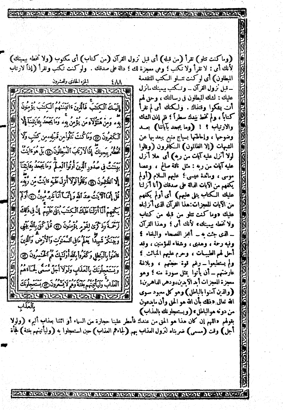 {وَمَا كُنتَ تَتْلُو} تقرأ {مِن قَبْلِهِ} أي قبل نزول القرآن {مِن كِتَابٍ} أي مكتوب {وَلاَ تَخُطُّهُ بِيَمِينِكَ} لأنك أمي: لا تقرأ ولا تكتب؛ وهي معجزة لك؛ دالة على صدقك. ولو كنت تكتب وتقرأ {إِذاً لاَّرْتَابَ الْمُبْطِلُونَ} أي لو كنت تتلو الكتب المتقدمة - قبل نزول القرآن - وتكتب بيمينك ما نزل عليك: لشك المبطلون في رسالتك، وحق لهم أن يشكوا وقتذاك. ولكنك أمي لم تقرأ كتاباً، ولم تخط بيدك سطراً؛ فلم إذن الشك والارتياب؟