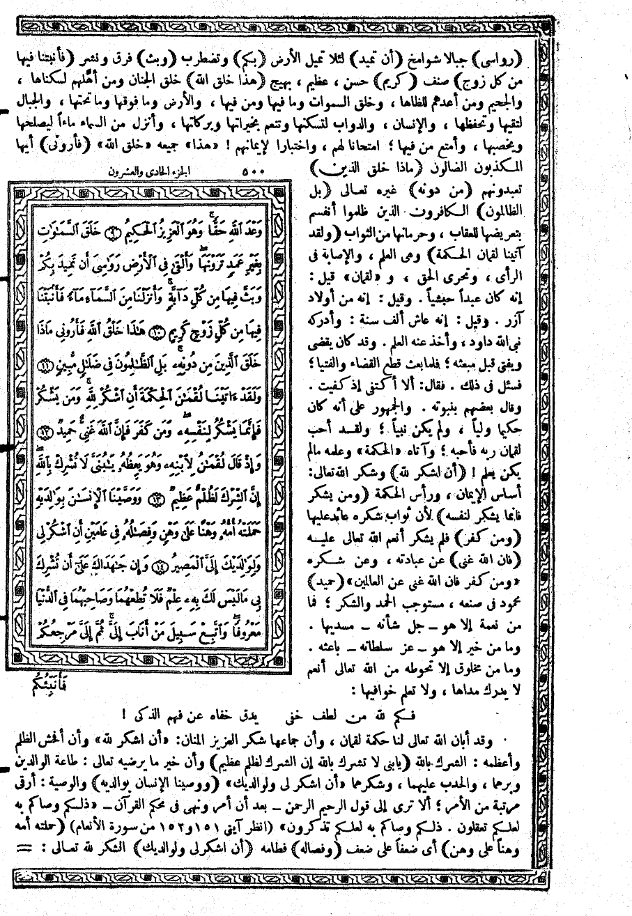 {وَلَقَدْ آتَيْنَا لُقْمَانَ الْحِكْمَةَ} وهي العلم، والإصابة في الرأي، وتحري الحق، و «لقمان» قيل: إنه كان عبداً حبشياً. وقيل: إنه من أولاد آزر. وقيل: إنه عاش ألف سنة: وأدركه نبي الله داود، وأخذ عنه العلم. وقد كان يقضي ويفتي قبل مبعثه؛ فلما بعث قطع القضاء والفتيا؛ فسئل في ذلك. فقال: ألا أكتفي إذ كفيت. وقال بعضهم بنبوته. والجمهور على أنه كان حكيماً ولياً، ولم يكن نبياً؛ ولقد أحب لقمان ربه فأحبه؛ وآتاه «الحكمة» وعلمه ما لم يكن يعلم {أَنِ اشْكُرْ للَّهِ} وشكر الله تعالى: أساس الإيمان، ورأس الحكمة {وَمَن يَشْكُرْ فَإِنَّمَا يَشْكُرُ لِنَفْسِهِ} لأن ثواب شكره عائد عليها {وَمَن كَفَرَ} فلم يشكر أنعم الله تعالى عليه {فَإِنَّ اللَّهَ غَنِيٌّ} عن عبادته، وعن شكره {وَمَن كَفَرَ فَإِنَّ الله غَنِيٌّ عَنِ الْعَالَمِينَ} {حَمِيدٌ} محمود في صنعه، مستوجب الحمد والشكر؛ فما من نعمة إلا هو - جل شأنه - مسديها. وما من خير إلا هو - عز سلطانه - باعثه. وما من مخلوق إلا تحوطه من الله تعالى أنعم لا يدرك مداها، ولا تعلم خوافيها: