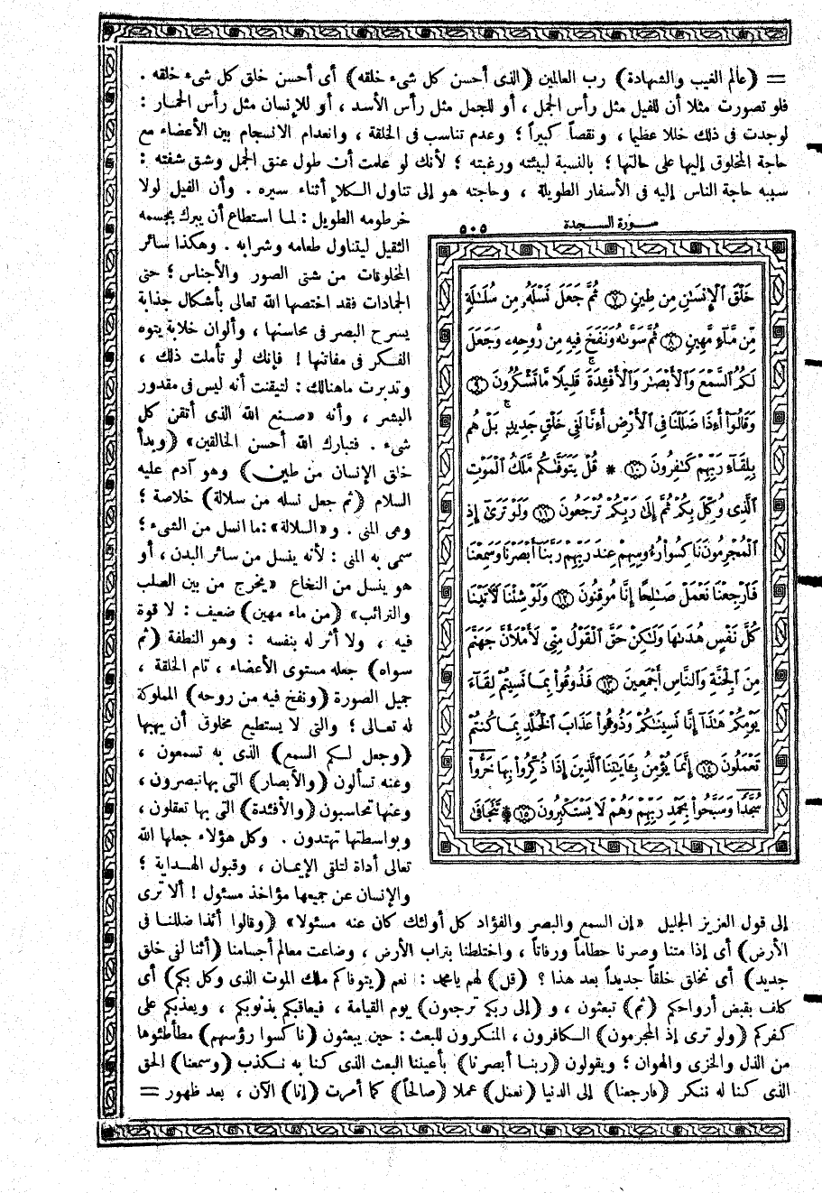 {الَّذِي أَحْسَنَ كُلَّ شَيْءٍ خَلَقَهُ} أي أحسن خلق كل شيء خلقه. فلو تصورت مثلاً أن للفيل مثل رأس الجمل، أو للجمل مثل رأس الأسد، أو للإنسان مثل رأس الحمار: لوجدت في ذلك خللاً عظيماً، ونقصاً كبيراً؛ وعدم تناسب في الخلقة، وانعدام الانسجام بين الأعضاء مع حاجة المخلوق إليها على حالتها؛ بالنسبة لبيئته ورغبته؛ لأنك لو علمت أن طول عنق الجمل وشق شفته: سببه حاجة الناس إليه في الأسفار الطويلة، وحاجته هو إلى تناول الكلإ أثناء سيره. وأن الفيل لولا خرطومه الطويل: لما استطاع أن يبرك بجسمه الثقيل ليتناول طعامه وشرابه. وهكذا سائر المخلوقات من شتى الصور والأجناس؛ حتى الجمادات فقد اختصها الله تعالى بأشكال جذابة يسرح البصر في محاسنها، وألوان خلابة يتوه الفكر في مفاتنها فإنك لو تأملت ذلك، وتدبرت ما هنالك: لتيقنت أنه ليس في مقدور البشر، وأنه {صُنْعَ اللَّهِ الَّذِي أَتْقَنَ كُلَّ شَيْءٍ} {فَتَبَارَكَ اللَّهُ أَحْسَنُ الْخَالِقِينَ} {وَبَدَأَ خَلْقَ الإِنْسَانِ مِن طِينٍ} وهو آدم عليه السلام