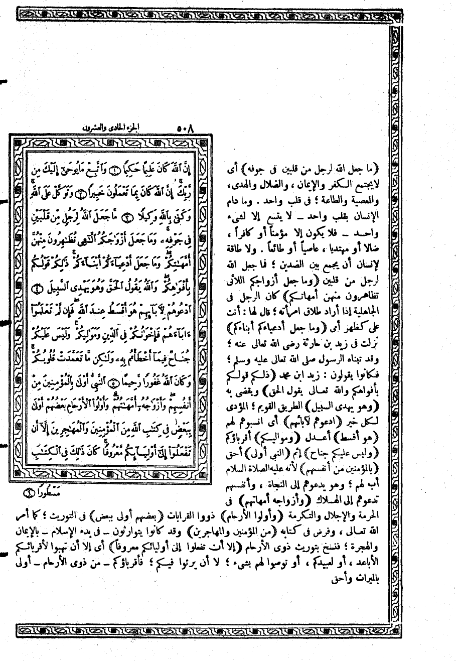 {مَّا جَعَلَ اللَّهُ لِرَجُلٍ مِّن قَلْبَيْنِ فِي جَوْفِهِ} أي لا يجتمع الكفر والإيمان، والضلال والهدى، والمعصية والطاعة؛ في قلب واحد. وما دام الإنسان بقلب واحد - لا يتسع إلا لشيء واحد - فلا يكون إلا مؤمناً أو كافراً، ضالاً أو مهتدياً، عاصياً أو طائعاً. ولا طاقة لإنسان أن يجمع بين الضدين؛ فما جعل الله لرجل من قلبين {وَمَا جَعَلَ أَزْوَاجَكُمُ اللاَّئِي تُظَاهِرُونَ مِنْهُنَّ أُمَّهَاتِكُمْ} كان الرجل في الجاهلية إذا أراد طلاق امرأته؛ قال لها: أنت علي كظهر أمي {وَمَا جَعَلَ أَدْعِيَآءَكُمْ أَبْنَآءَكُمْ} نزلت في زيدبن حارثة رضي الله تعالى عنه؛ وقد تبناه الرسول؛ فكانوا يقولون: زيد ابن محمد {ذَلِكُمْ قَوْلُكُم بِأَفْوَاهِكُمْ وَاللَّهُ يَقُولُ الْحَقَّ} ويقضي به {وَهُوَ يَهْدِي السَّبِيلَ} الطريق القويم؛ المؤدي لكل خير