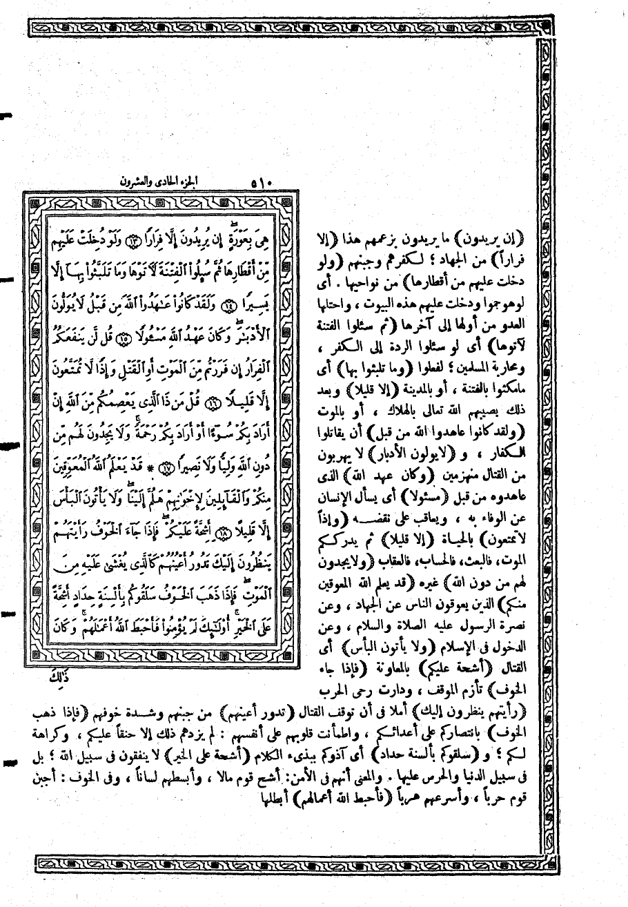 {أَشِحَّةً عَلَيْكُمْ} بالمعاونة {فَإِذَا جَآءَ الْخَوْفُ} تأزم الموقف، ودارت رحى الحرب {رَأَيْتَهُمْ يَنظُرُونَ إِلَيْكَ} أملاً في أن توقف القتال {تَدورُ أَعْيُنُهُمْ} من جبنهم وشدة خوفهم {فَإِذَا ذَهَبَ الْخَوْفُ} بانتصاركم على أعدائكم، واطمأنت قلوبهم على أنفسهم: لم يزدهم ذلك إلا حنقاً عليكم، وكراهة لكم؛ و {سَلَقُوكُمْ بِأَلْسِنَةٍ حِدَادٍ} أي آذوكم ببذيء الكلام {أَشِحَّةً عَلَى الْخَيْرِ} لا ينفقون في سبيلالله؛ بل في سبيل الدنيا والحرص عليها. والمعنى أنهم في الأمن: أشح قوم مالاً، وأبسطهم لساناً، وفي الخوف: أجبن قوم حرباً، وأسرعهم هرباً {فَأَحْبَطَ اللَّهُ أَعْمَالَهُمْ} أبطلها