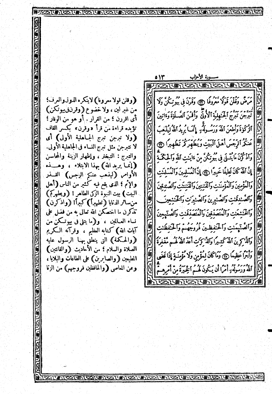 {وَقَرْنَ فِي بُيُوتِكُنَّ} أي اقررن؛ من القرار. أو هو من الوقار؛ تؤيده قراءة من قرأ «وقرن» بكسر القاف {وَلاَ تَبَرَّجْنَ تَبَرُّجَ الْجَاهِلِيَّةِ الأُولَى} أي لا تتبرجن مثل تبرج النساء في الجاهلية الأولى. والتبرج: التبختر، وإظهار الزينة والمحاسن {أَنَّمَا يُرِيدُ اللَّهُ} بهذا الابتلاء، وهذه الأوامر {لِيُذْهِبَ عَنكُمُ الرِّجْسَ} القذر والإثم؛ الذي يقع فيه كثير من الناس {أَهْلَ الْبَيْتِ} بيت النبوة الزكي الطاهر {وَيُطَهِّرَكُمْ} من سائر الدنايا {تَطْهِيراً} كبيراً