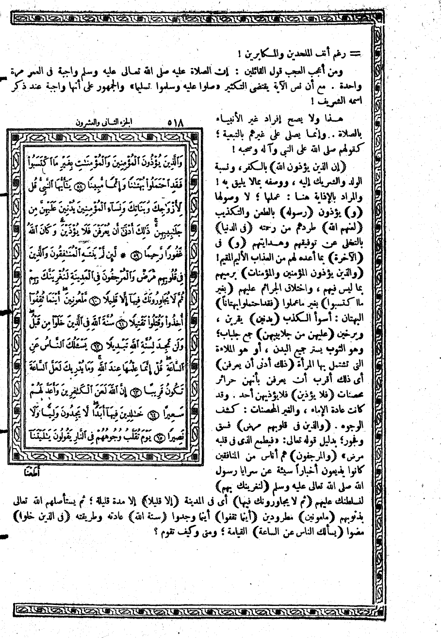 {يُدْنِينَ} يقربن، ويرخين {عَلَيْهِنَّ مِن جَلاَبِيبِهِنَّ} جمع جلباب؛ وهو الثوب يستر جميع البدن، أو هو الملاءة التي تشتمل بها المرأة {ذلِكَ أَدْنَى أَن يُعْرَفْنَ} أي ذلك أقرب أن يعرفن بأنهن حرائر محصنات {فَلاَ يُؤْذَيْنَ} فلا يؤذيهن أحد. وقد كانت عادة الإماء، والغير المحصنات: كشف الوجوه. {وَالَّذِينَ فِي قُلُوبِهِم مَّرَضٌ} فسق وفجور؛ بدليل قوله تعالى: {فَيَطْمَعَ الَّذِي فِي قَلْبِهِ مَرَضٌ}