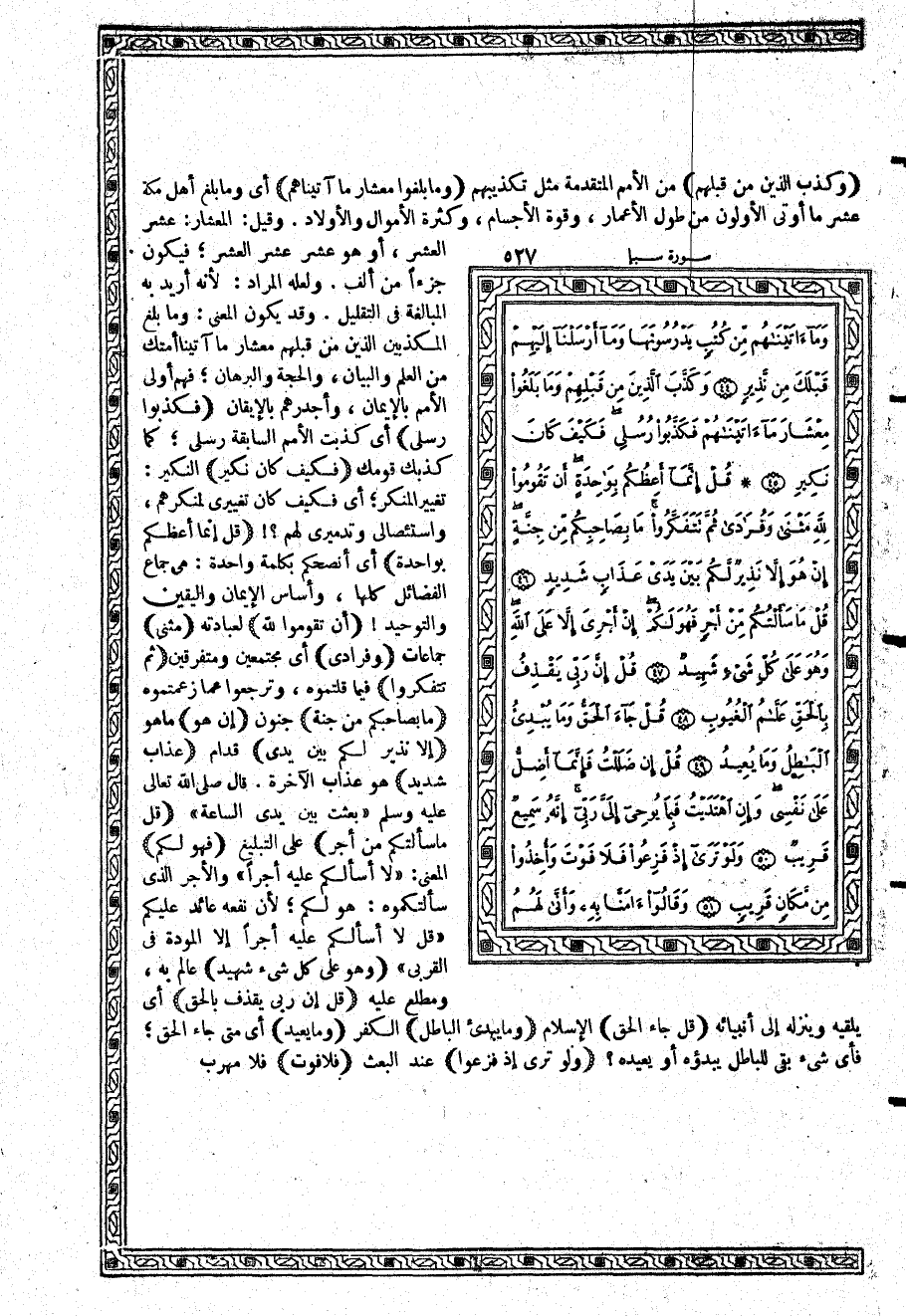 {قُلْ إِنَّمَآ أَعِظُكُمْ بِوَاحِدَةٍ} أي أنصحكم بكلمة واحدة: هي جماع الفضائل كلها، وأساس الإيمان واليقين والتوحيد {أَن تَقُومُواْ لِلَّهِ} لعبادته {مَثْنَى} جماعات {وَفُرَادَى} أي مجتمعين ومتفرقين {ثُمَّ تَتَفَكَّرُواْ} فيما قلتموه، وترجعوا عما زعمتموه {مَا بِصَاحِبِكُمْ مِّن جِنَّةٍ} جنون {إِنْ هُوَ} ما هو {إِلاَّ نَذِيرٌ لَّكُمْ بَيْنَ يَدَيْ} قدام {عَذَابٍ شَدِيدٍ} هو عذاب الآخرة. قال: «بعثت بين يدي الساعة»