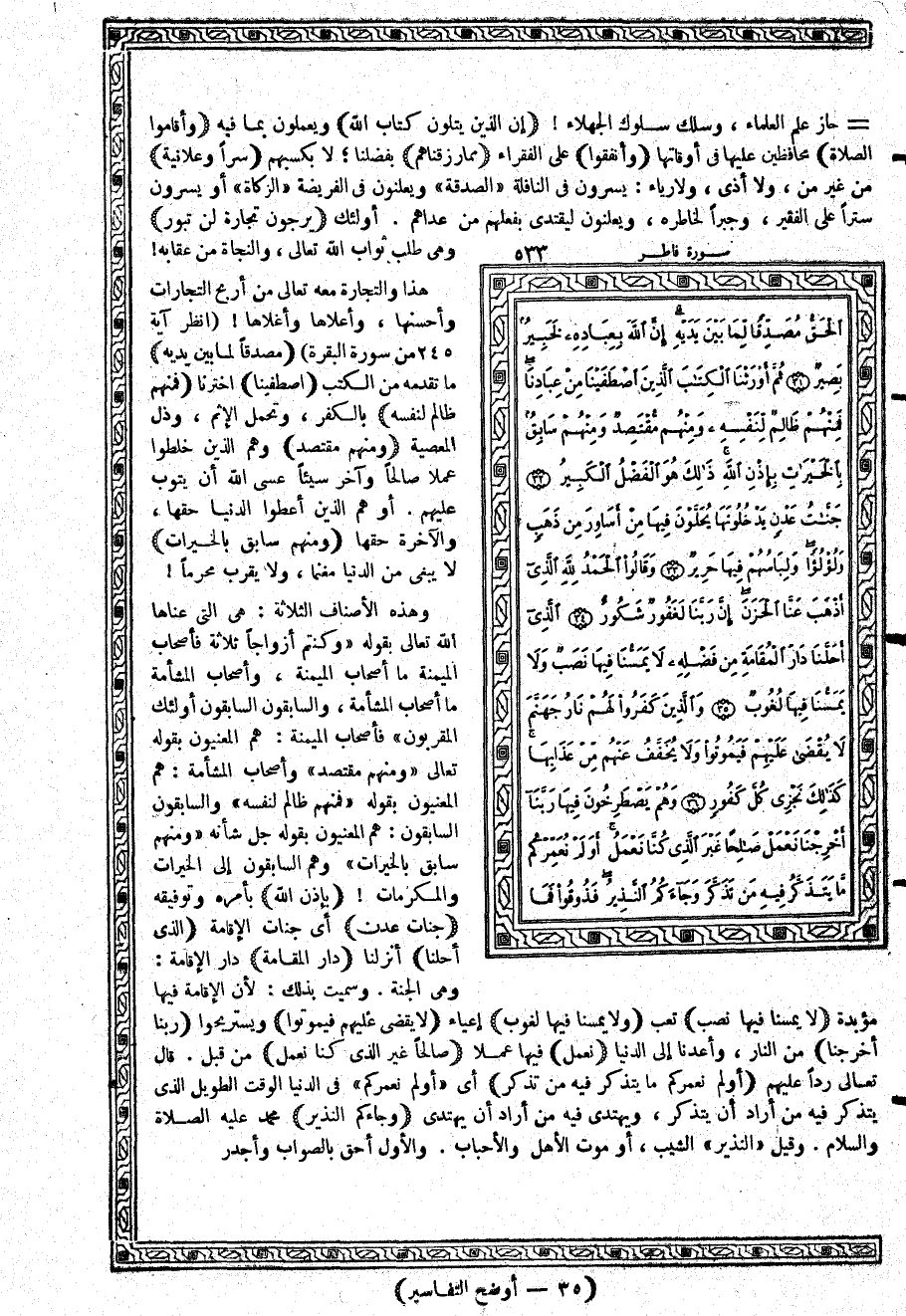 وهذه الأصناف الثلاثة: هي التي عناها الله تعالى بقوله {وَكُنتُمْ أَزْوَاجاً ثَلاَثَةً * فَأَصْحَابُ الْمَيْمَنَةِ مَآ أَصْحَابُ الْمَيْمَنَةِ * وَأَصْحَابُ الْمَشْأَمَةِ مَآ أَصْحَابُ الْمَشْأَمَةِ * وَالسَّابِقُونَ السَّابِقُونَ * أُوْلَئِكَ الْمُقَرَّبُونَ} فأصحاب الميمنة: هم المعنيون بقوله تعالى {وَمِنْهُمْ مُّقْتَصِدٌ} وأصحاب المشأمة: هم المعنيون بقوله {فَمِنْهُمْ ظَالِمٌ لِّنَفْسِهِ} والسابقون السابقون: هم المعنيون بقوله جل شأنه {وَمِنْهُمْ سَابِقٌ بِالْخَيْرَاتِ} وهم السابقون إلى الخيرات والمكرمات {بِإِذُنِ اللَّهِ} بأمره وتوفيقه {