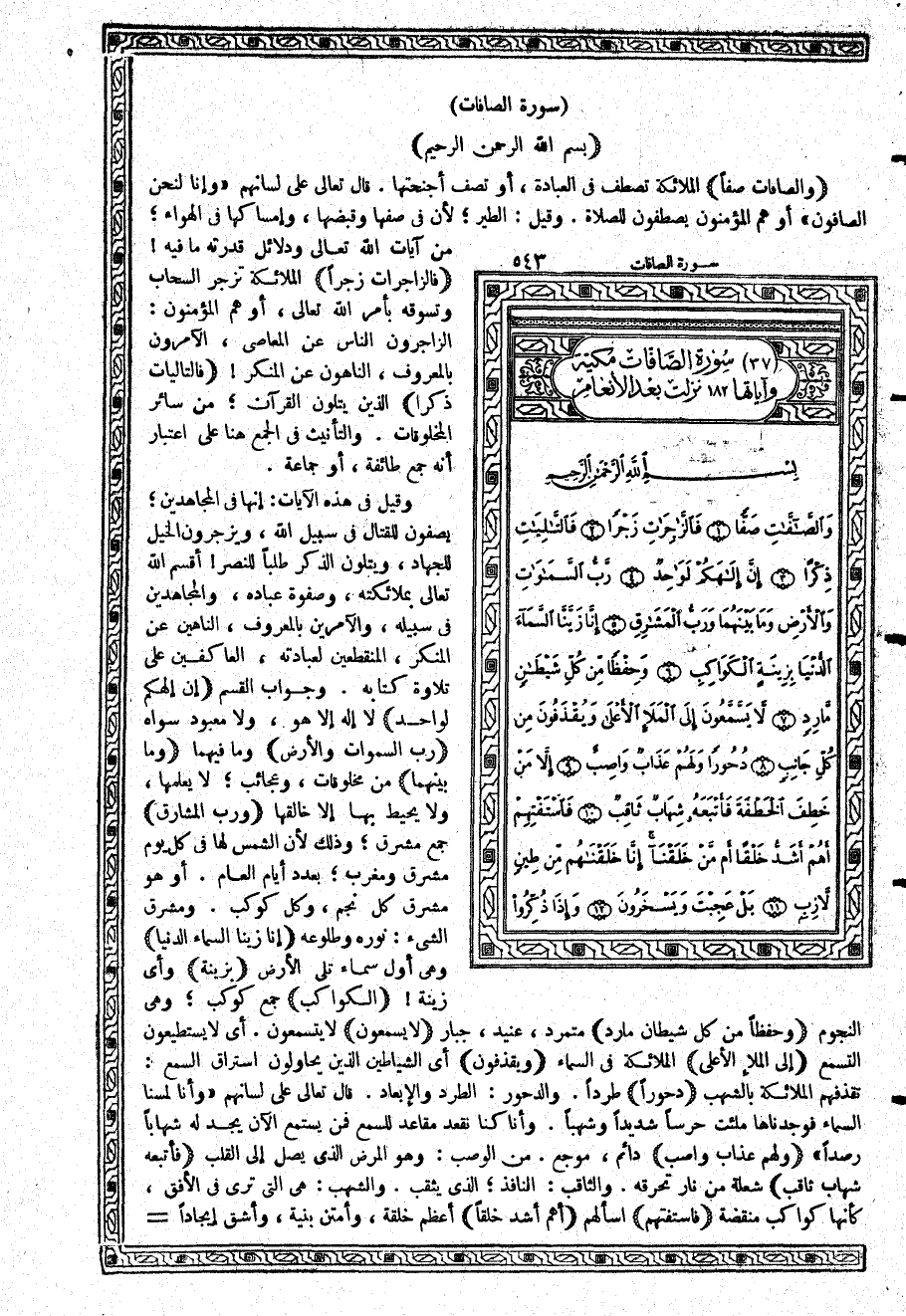 {وَالصَّافَّاتِ صَفَّا} الملائكة تصطف في العبادة، أو تصف أجنحتها. قال تعالى على لسانهم {وَإِنَّا لَنَحْنُ الصَّآفُّونَ} أو هم المؤمنون يصطفون للصلاة. وقيل: الطير؛ لأن في صفها وقبضها، وإمساكها في الهواء؛ من آيات الله تعالى ودلائل قدرته ما فيه