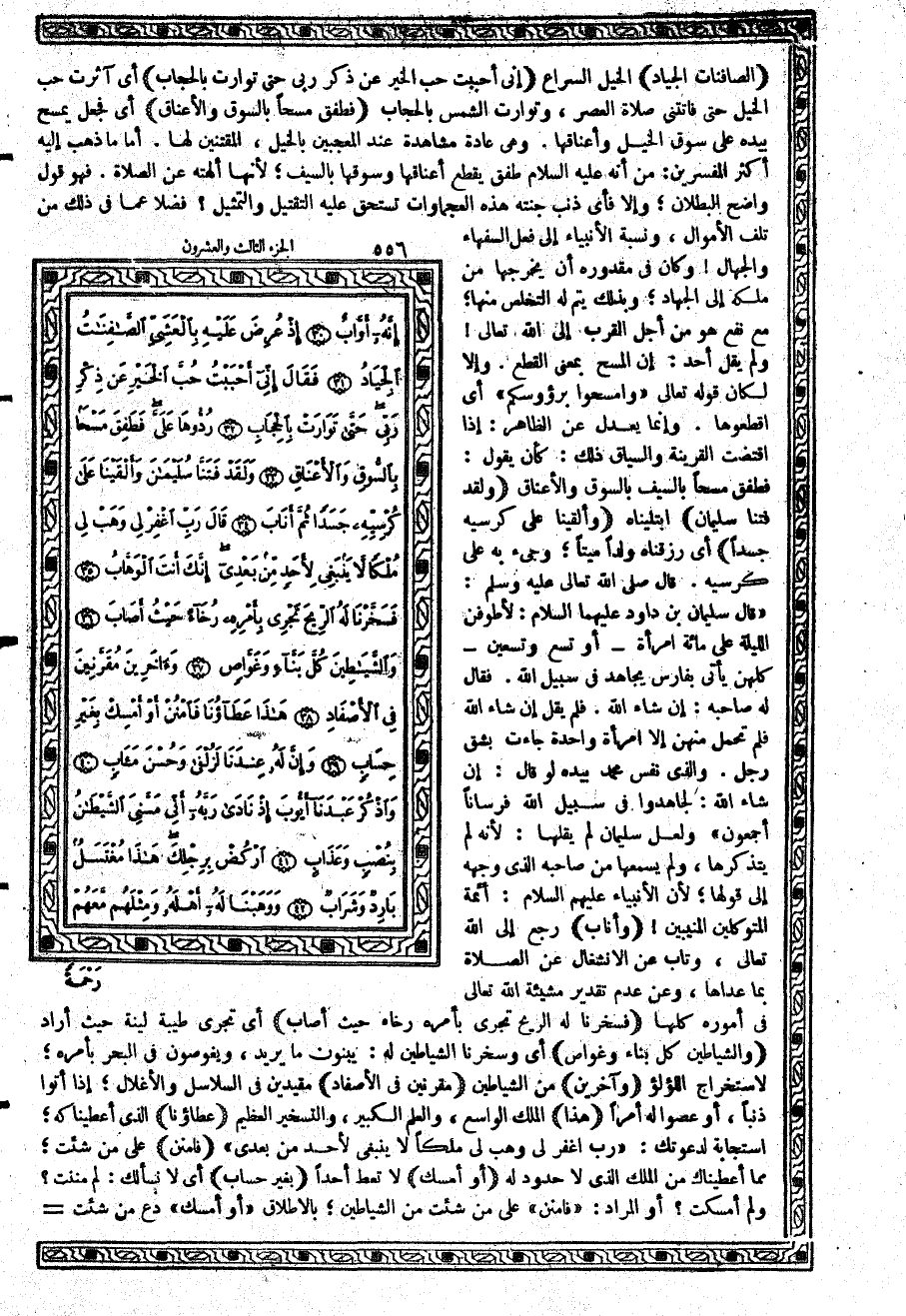 {إِنِّي أَحْبَبْتُ حُبَّ الْخَيْرِ عَن ذِكْرِ رَبِّي حَتَّى تَوَارَتْ بِالْحِجَابِ} أي آثرت حب الخيل حتى فاتتني صلاة العصر، وتوارت الشمس بالحجاب