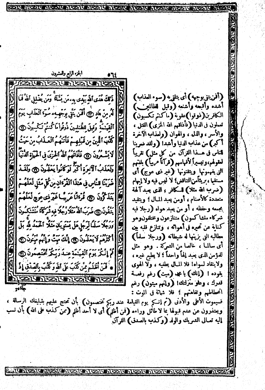 {ضَرَبَ اللَّهُ مَثَلاً} للكافر، الذي يعبد آلهة متعددة كالأصنام، أو من يعبد المال؛ ويتقيد بجمعه وحفظه، أو من يعبد هواه {رَّجُلاً فِيهِ شُرَكَآءُ مُتَشَاكِسُونَ} متنازعون ومختلفون وهو كناية عن تحيره في أهوائه، وتنازع قلبه بين مطالبه التي يزينها له شيطانه {وَرَجُلاً سَلَماً} أي سالماً، خالصاً من الشركة. وهو مثل للمؤمن الذي يعبد إلهاً واحداً؛ لا يطيع غيره، ولا ينقاد لسواه فلا المال يطغيه، ولا الهوى يقوده