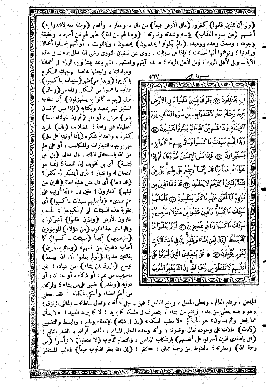 {وَلَوْ أَنَّ لِلَّذِينَ ظَلَمُواْ} كفروا {مَا فِي الأَرْضِ جَمِيعاً} من مال، وعقار، وأنعام {وَمِثْلَهُ مَعَهُ لاَفْتَدَوْاْ بِهِ} أنفسهم {مِن سُوءِ الْعَذَابِ} بؤسه وشدته وقسوته {وَبَدَا لَهُمْ مِّنَ اللَّهِ} ظهر لهم من أمره، وحقيقة وجوده، وصدق وعده ووعيده {مَا لَمْ يَكُونُواْ يَحْتَسِبُونَ} يحسبون، ويظنون. أو أنهم عملوا أعمالاً في الدنيا؛ وتوهموا أنها حسنات؛ فإذا هي سيئات. روي عن سفيان الثوري رضي الله تعالى عنه - في هذه الآية - ويل لأهل الرياء، ويل لأهل الرياء؛ هذه آيتهم وقصتهم. اللهم باعد بيننا وبين الرياء في أعمالنا وعباداتنا، واجعلها خالصة لوجهك الكريم يا كريم