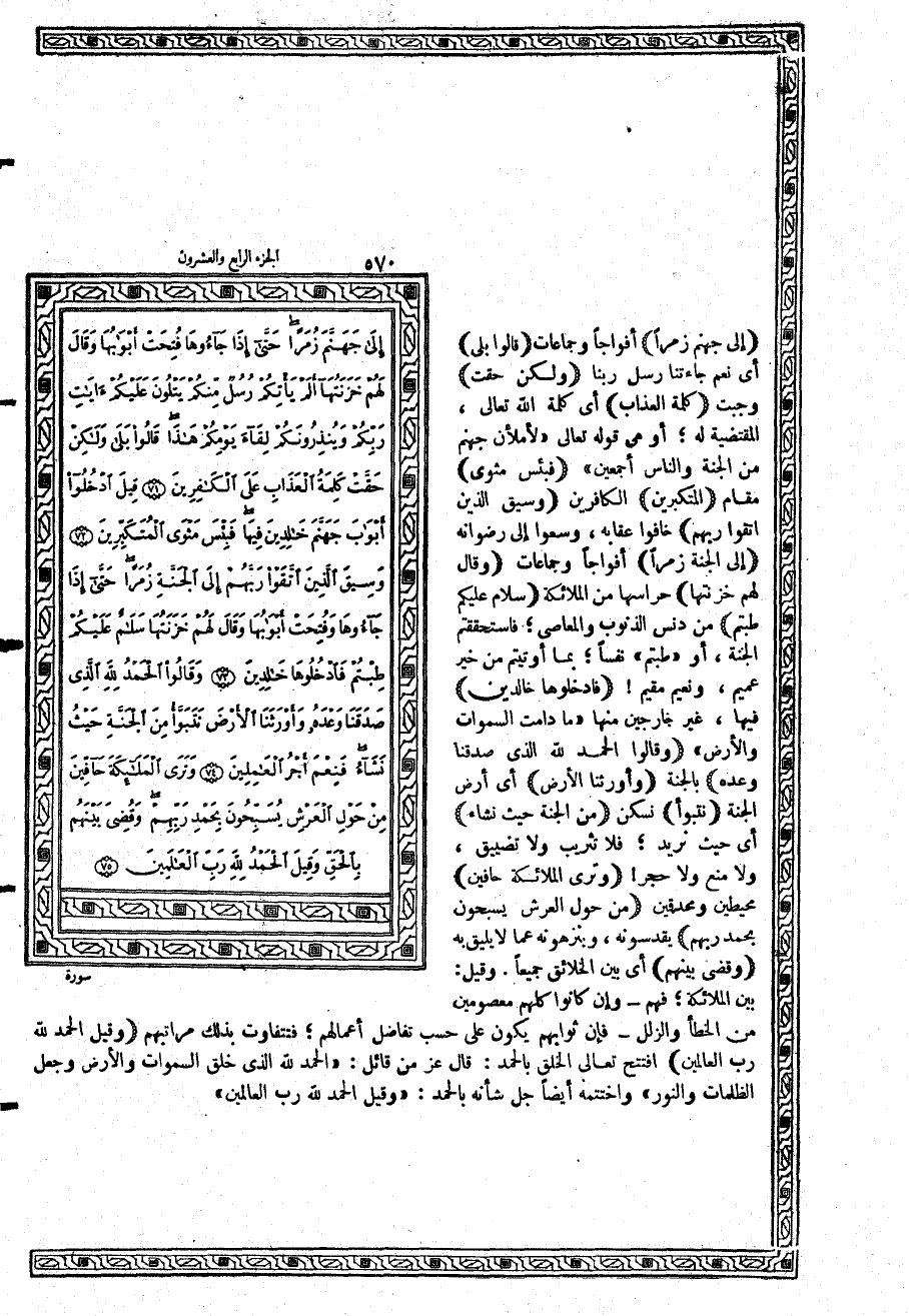 {مِنْ حَوْلِ الْعَرْشِ يُسَبِّحُونَ بِحَمْدِ رَبِّهِمْ} يقدسونه، وينزهونه عما لا يليق به {وَقُضِيَ بَيْنَهُمْ} أي بين الخلائق جميعاً. وقيل: بين الملائكة؛ فهم - وإن كانوا كلهم معصومين من الخطأ والزلل - فإن ثوابهم يكون على حسب تفاضل أعمالهم؛ فتتفاوت بذلك مراتبهم {وَقِيلَ الْحَمْدُ لِلَّهِ رَبِّ الْعَالَمِينَ} افتتح تعالى الخلق بالحمد: قال عز من قائل: {الْحَمْدُ للَّهِ الَّذِي خَلَقَ السَّمَاوَاتِ وَالأَرْضَ وَجَعَلَ الظُّلُمَاتِ وَالنُّورَ} واختتمه أيضاً جل شأنه بالحمد: «وقيل الحمدلله رب العالمين».