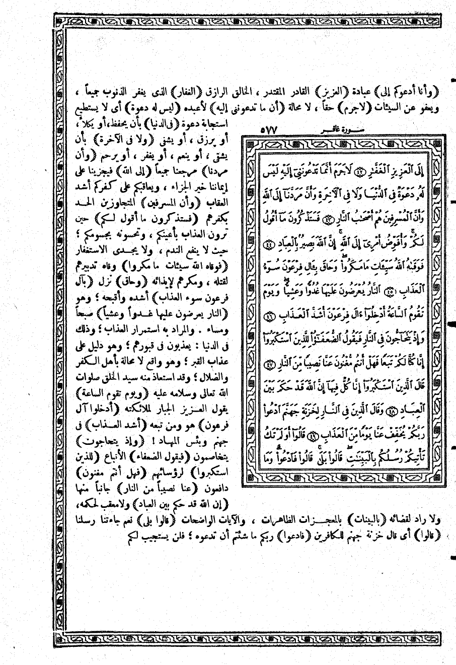 {النَّارُ يُعْرَضُونَ عَلَيْهَا غُدُوّاً وَعَشِيّاً} صبحاً ومساءاً. والمراد به استمرار العذاب؛ وذلك في الدنيا: يعذبون في قبورهم؛ وهو دليل على عذاب القبر؛ وهو واقع لا محالة بأهل الكفر والضلال؛ وقد استعاذ منه سيد الخلق صلوات الله تعالى وسلامه عليه {وَيَوْمَ تَقُومُ السَّاعَةُ} يقول العزيز الجبار لملائكته {أَدْخِلُواْ آلَ فِرْعَوْنَ} هو ومن تبعه {أَشَدَّ الْعَذَابِ} في جهنم وبئس المهاد