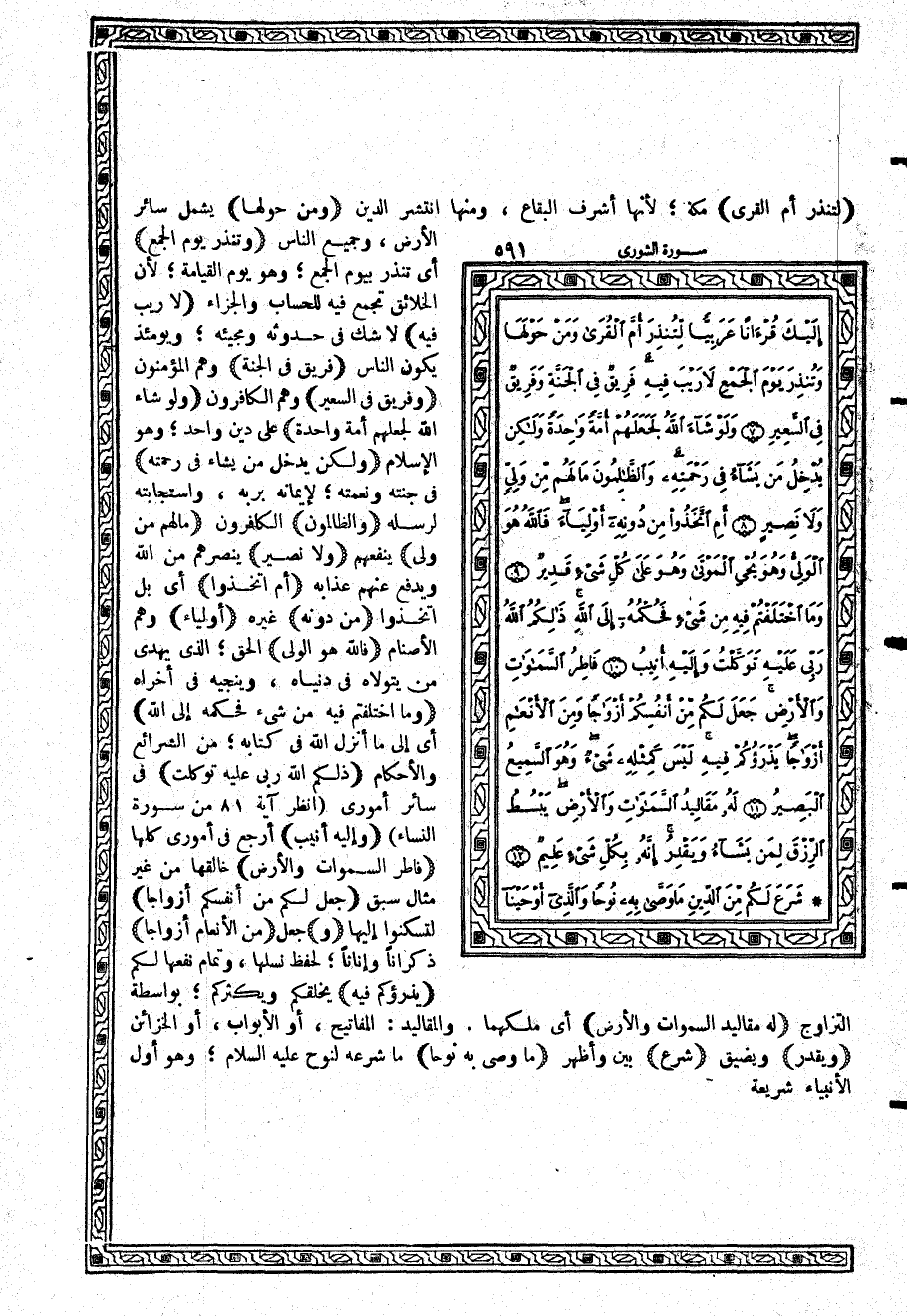 {لِّتُنذِرَ أُمَّ الْقُرَى} مكة؛ لأنها أشرف البقاع، ومنها انتشر الدين {وَمَنْ حَوْلَهَا} يشمل سائر الأرض، وجميع الناس {وَتُنذِرَ يَوْمَ الْجَمْعِ} أي تنذر بيوم الجمع؛ وهو يوم القيامة؛ لأن الخلائق تجمع فيه للحساب والجزاء {لاَ رَيْبَ فِيهِ} لا شك في حدوثه ومجيئه؛ ويومئذٍ يكون الناس {فَرِيقٌ فِي الْجَنَّةِ} وهم المؤمنون {وَفَرِيقٌ فِي السَّعِيرِ} وهم الكافرون