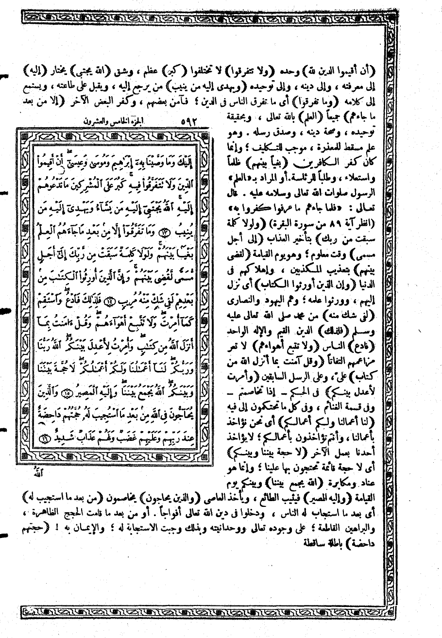 {وَمَا تَفَرَّقُواْ} أي ما تفرق الناس في الدين؛ فآمن بعضهم، وكفر البعض الآخر {إِلاَّ مِن بَعْدِ مَا جَآءَهُمُ} جميعاً {الْعِلْمُ} بالله تعالى، وبحقيقة توحيده، وصحة دينه، وصدق رسله. وهو علم مسقط للمعذرة، موجب للتكليف؛ وإنما كان كفر الكافرين {بَغْياً بَيْنَهُمْ} ظلماً واستعلاء، وطلباً للرئاسة. أو المراد بـ «العلم» الرسول صلوات الله تعالى وسلامه عليه. قال تعالى: {فَلَمَّا جَآءَهُمْ مَّا عَرَفُواْ كَفَرُواْ بِهِ} (انظر آية 89 من سورة البقرة) {وَلَوْلاَ كَلِمَةٌ سَبَقَتْ مِن رَّبِّكَ} بتأخير العذاب {إِلَى أَجَلٍ مُّسَمًّى} وقت معلوم؛ وهو يوم القيامة {لَّقُضِيَ بِيْنَهُمْ} بتعذيب المكذبين، وإهلاكهم في والدنيا {وَإِنَّ الَّذِينَ أُورِثُواْ الْكِتَابَ} أي نزل إليهم، وورثوا علمه؛ وهم اليهود والنصارى {لَفِي شَكٍّ مِّنْهُ} من محمد