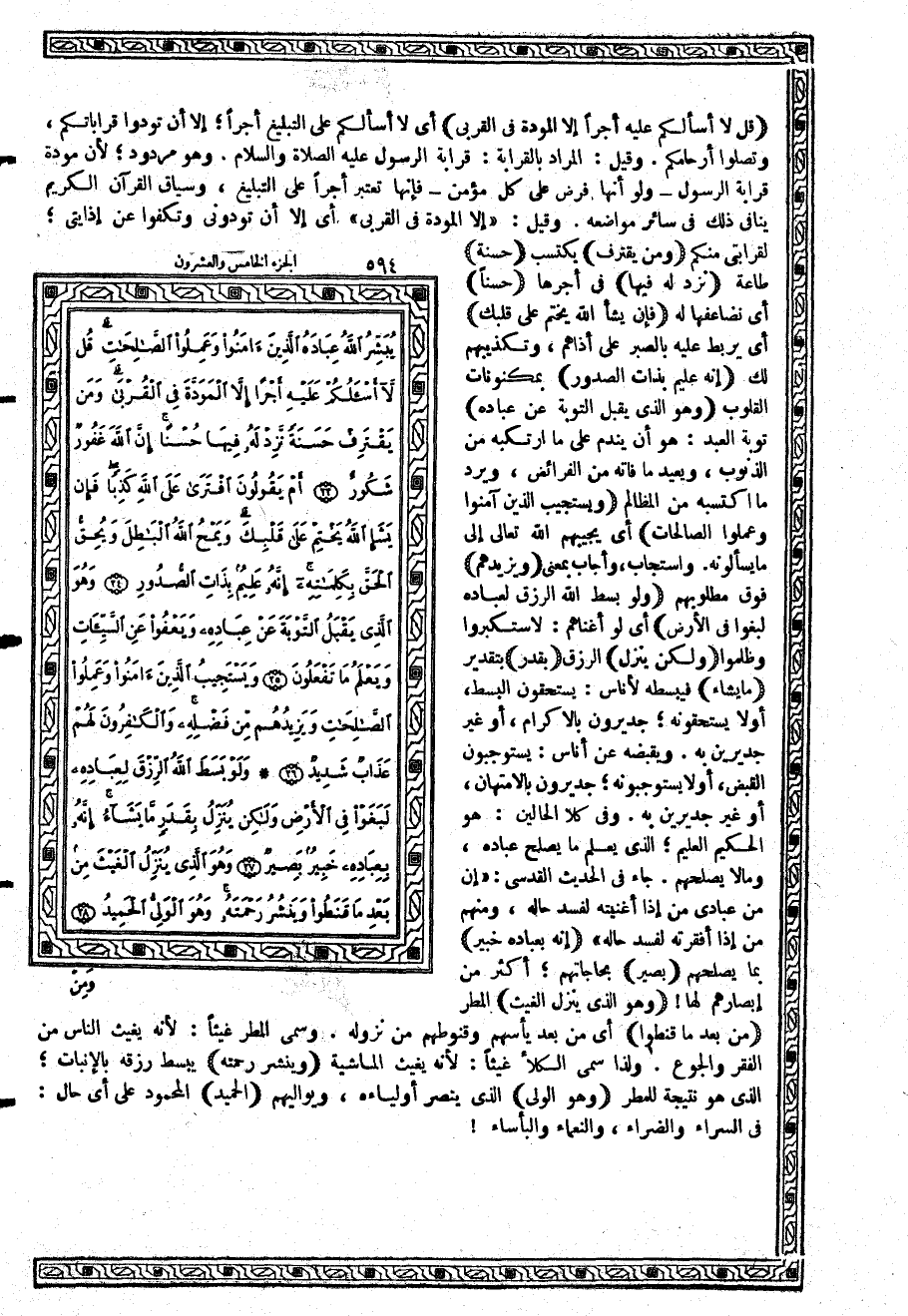 {قُل لاَّ أَسْأَلُكُمْ عَلَيْهِ أَجْراً إِلاَّ الْمَوَدَّةَ فِي الْقُرْبَى} أي لا أسألكم على التبليغ أجراً؛ إلا أن تودوا قراباتكم، وتصلوا أرحامكم. وقيل: المراد بالقرابة: قرابة الرسول عليه الصلاة والسلام. وهو مردود؛ لأن مودة قرابة الرسول - ولو أنها فرض على كل مؤمن - فإنها تعتبر أجراً على التبليغ، وسياق القرآن الكريم ينافي ذلك في سائر مواضعه. وقيل: