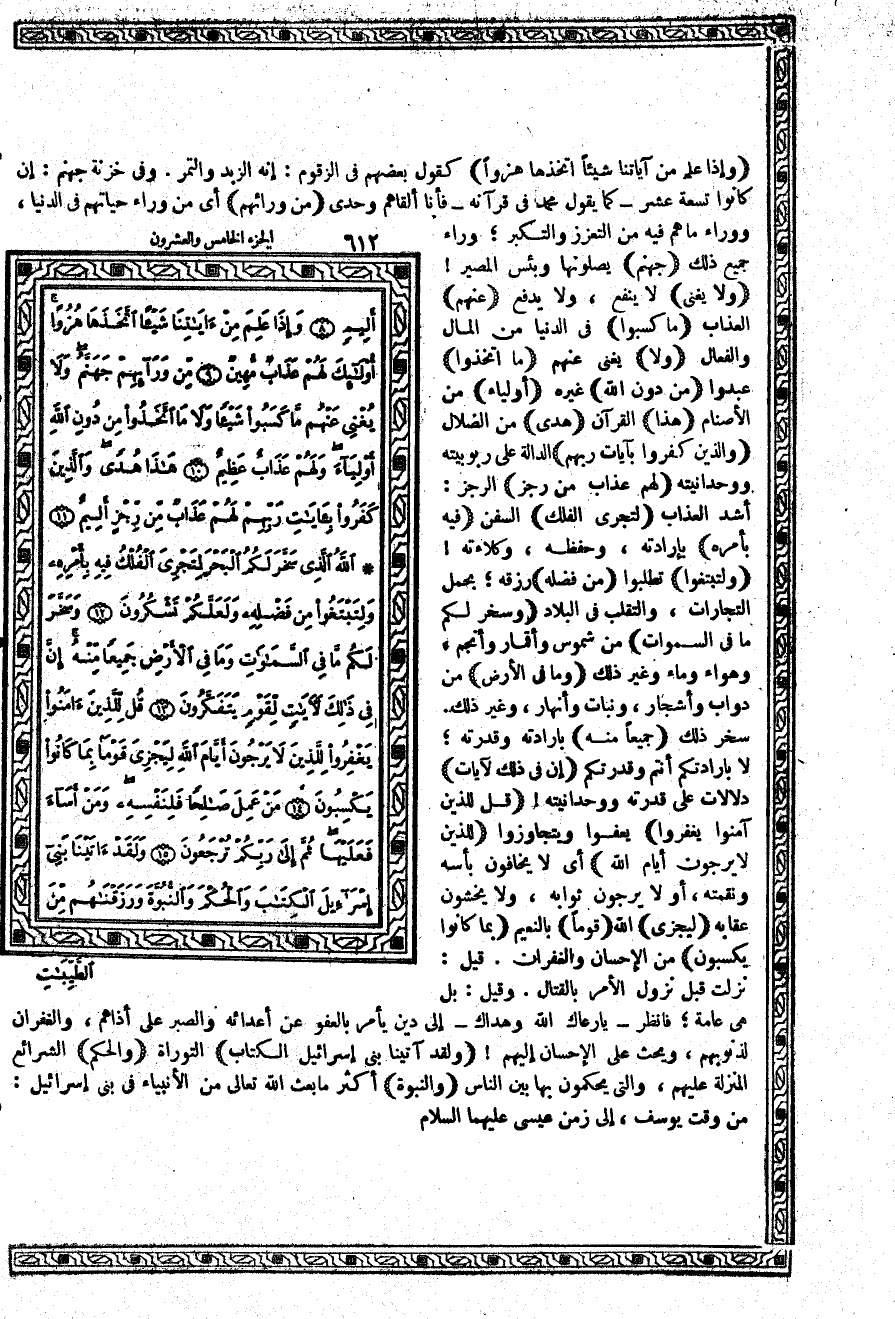 {قُل لِّلَّذِينَ آمَنُواْ يَغْفِرُواْ} يعفوا ويتجاوزوا {لِلَّذِينَ لاَ يَرْجُونَ أَيَّامَ اللَّهِ} أي لا يخافون بأسه ونقمته، أو لا يرجون ثوابه، ولا يخشون عقابه {لِيَجْزِيَ} الله {قَوْماً} بالنعيم {بِمَا كَانُواْ يَكْسِبُونَ} من الإحسان والغفران. قيل: نزلت قبل نزول الأمر بالقتال. وقيل: بل هي عامة؛ فانظر - يا رعاك الله وهداك - إلى دين يأمر بالعفو عن أعدائه والصبر على أذاهم، والغفران لذنوبهم، ويحث على الإحسان إليهم